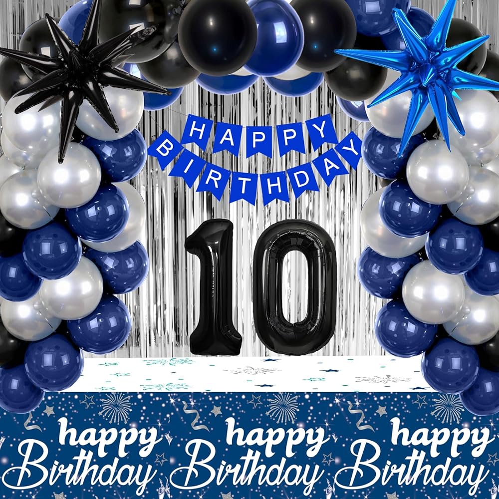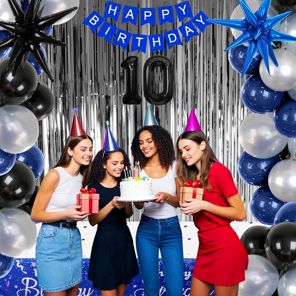 10th Birthday Decorations for Boys Girls, Blue Silver Happy 10th Birthday Decorations with 10th HAPPY BIRTHDAY Banner Tablecloth Garland Balloons Fringe Curtain, 10 Year Old Boy Party Decor Supplies