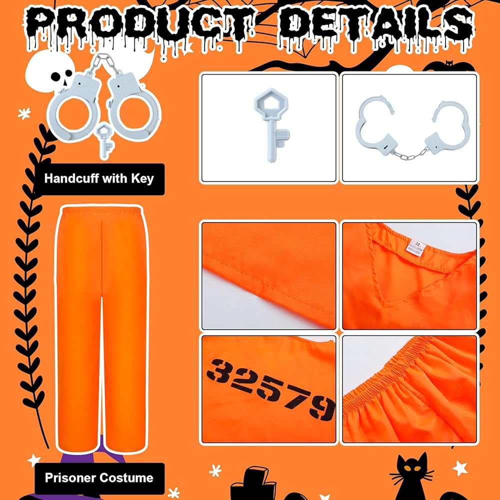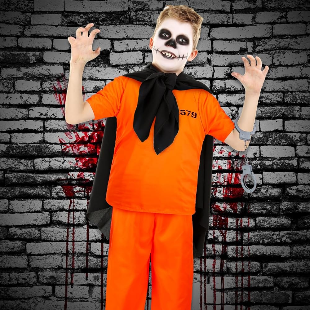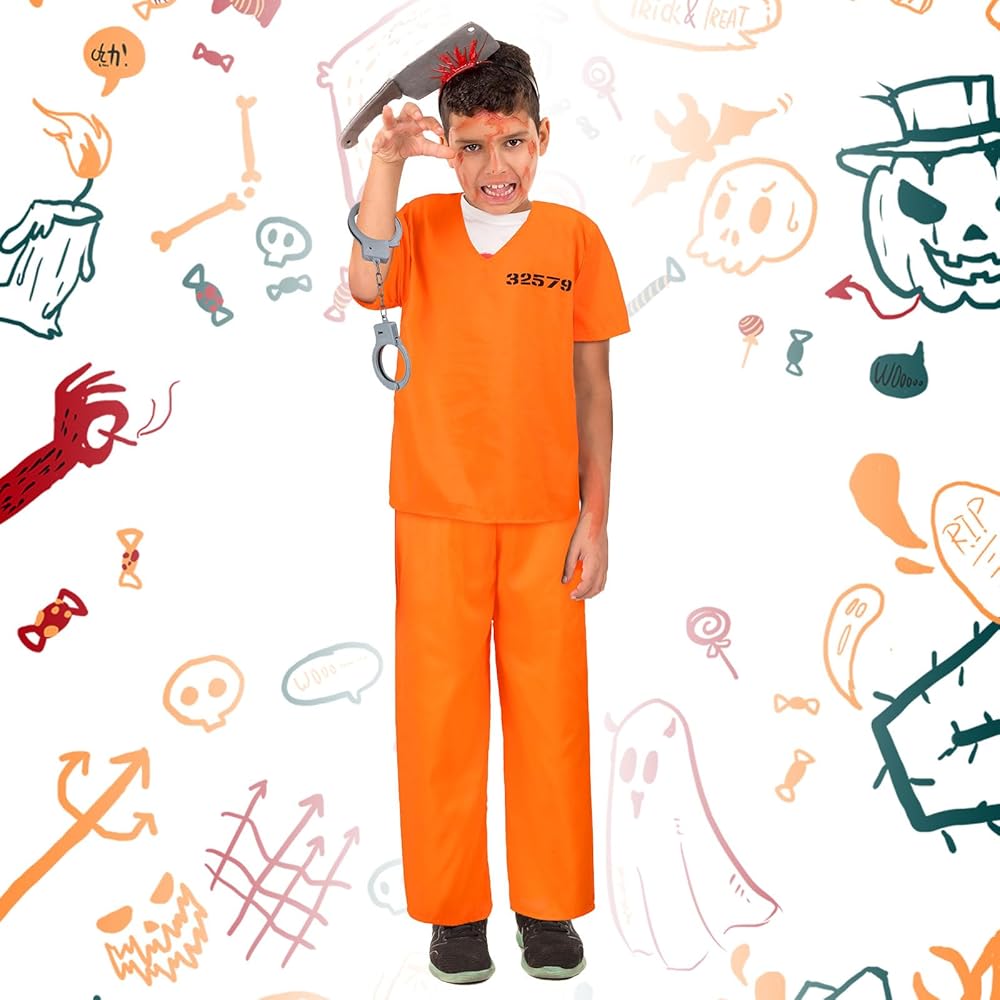 With this Halloween cosplay prisoner costume kid with handcuff, kids can experience the true feeling of being a prisoner. The vibrant orange prison uniform, handcuffs, and ID card lend a high degree of realism to transform your child into the star of most role playing activity or costume party.