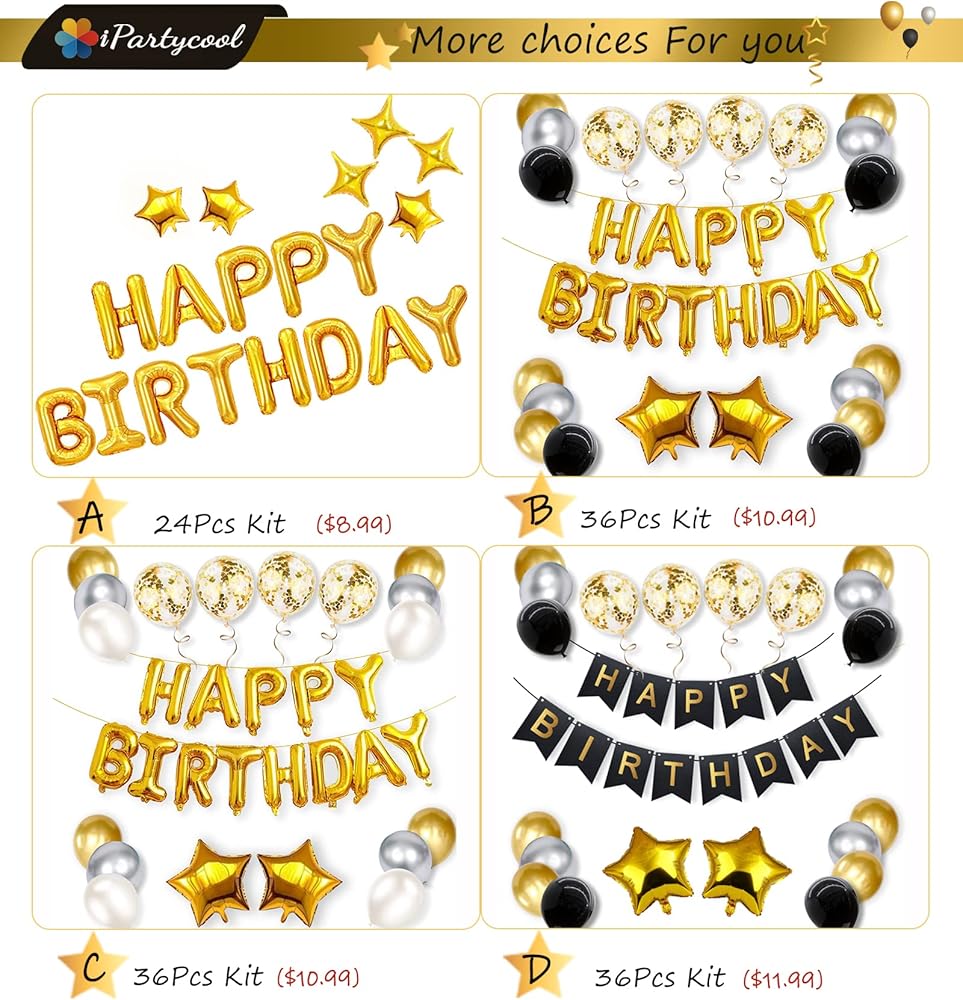 iPartycool 24pcs Happy Birthday Balloons, Birthday Decorations, 3D Gold Premium Foil Letter Happy Birthday Banner with 6pcs Star Balloons for Kids Men Women Adults Birthday Party Decorations Supplies