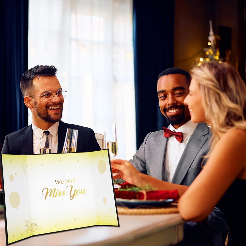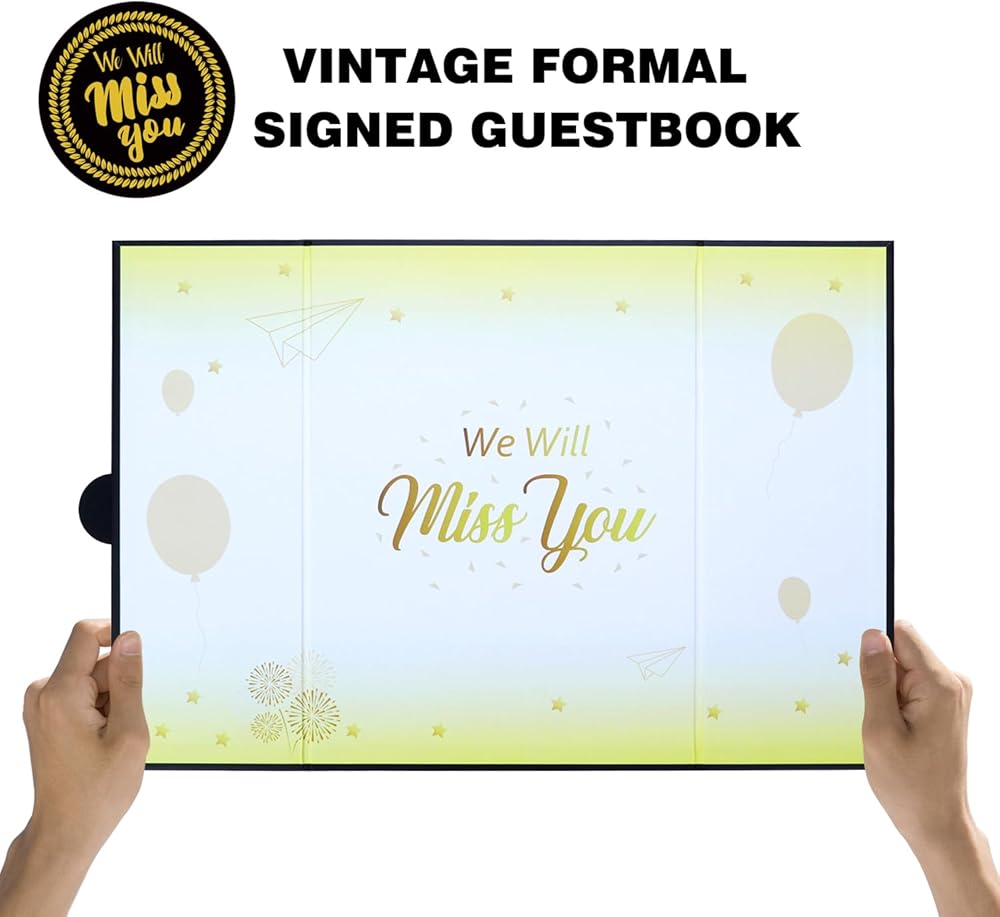【Exquisite Design】- The black certificate has a gilded badge on the cover, and the inside of the signature certificate is divided into three parts, the middle page is printed with the message 'We will miss you'. This black farewell signature board can be opened directly and stand on the table. Tips: No pen.