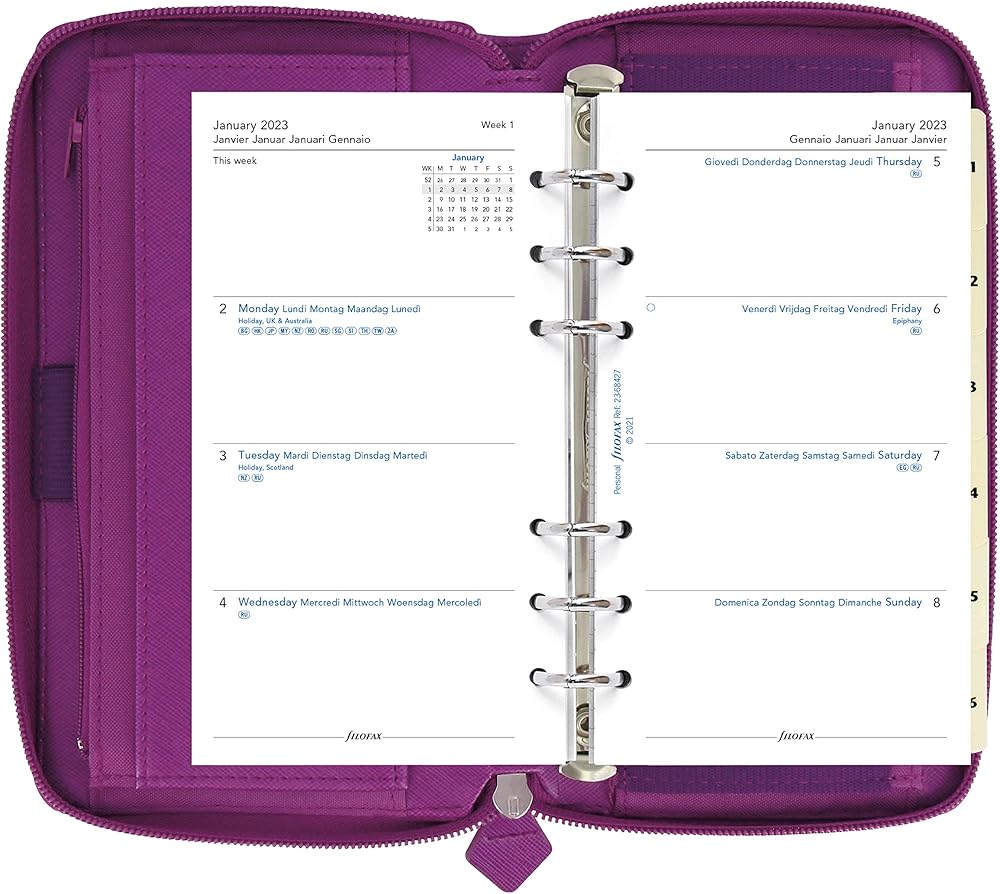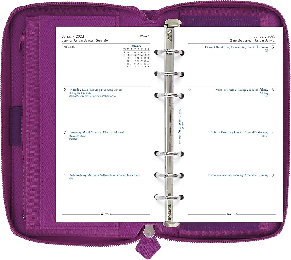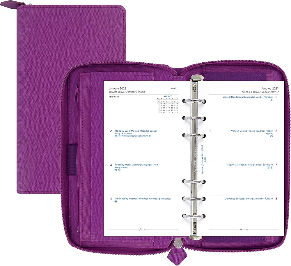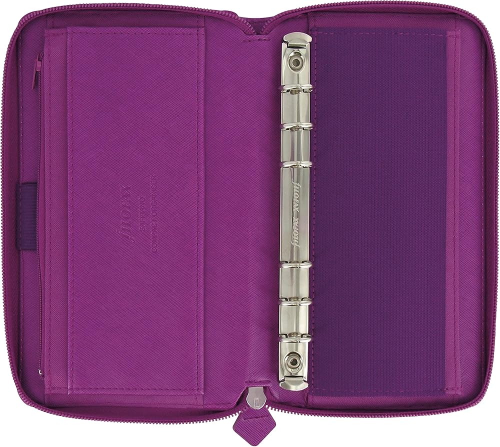 The iconic Saffiano Personal Compact Zip Collection combines simple construction of clean lines and stitched edges with the cross-grain, leather-look cover for a sophisticated, classic feel. Features removable ring mechanism, RFID protection in the cover, and zip-around closure for wallet/purse functionality in on-trend colors. Contents include: a six-ring binder, indices, assorted notepaper, ruler/page marker, to-do lists, contact sheets, and multilingual week-on-two pages calendar diary. Organizer contains card pockets, one zipped pocket, vertical slip pockets, exterior slip pocket, and one elastic pen loop. Compatible with additional Filofax refills and accessories available in Personal size. The future of planning is here. Plan, scan, click and go with Filofax® Organizers featuring Plan & Link™. Download the free Filofax® Reminder app, powered by InkLink™ technology, from the App Store and Google Play. Over the years, the Filofax Organizer has evolved from a simple loose-leaf system into an indispensable everyday accessory. The Filofax logo promises authenticity and the finest craftsmanship. It's a hallmark of impeccable quality, trusted worldwide, since 1921.