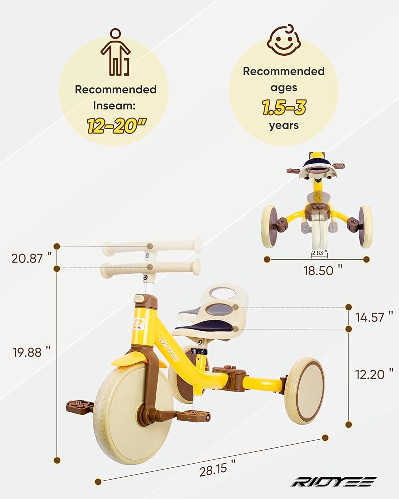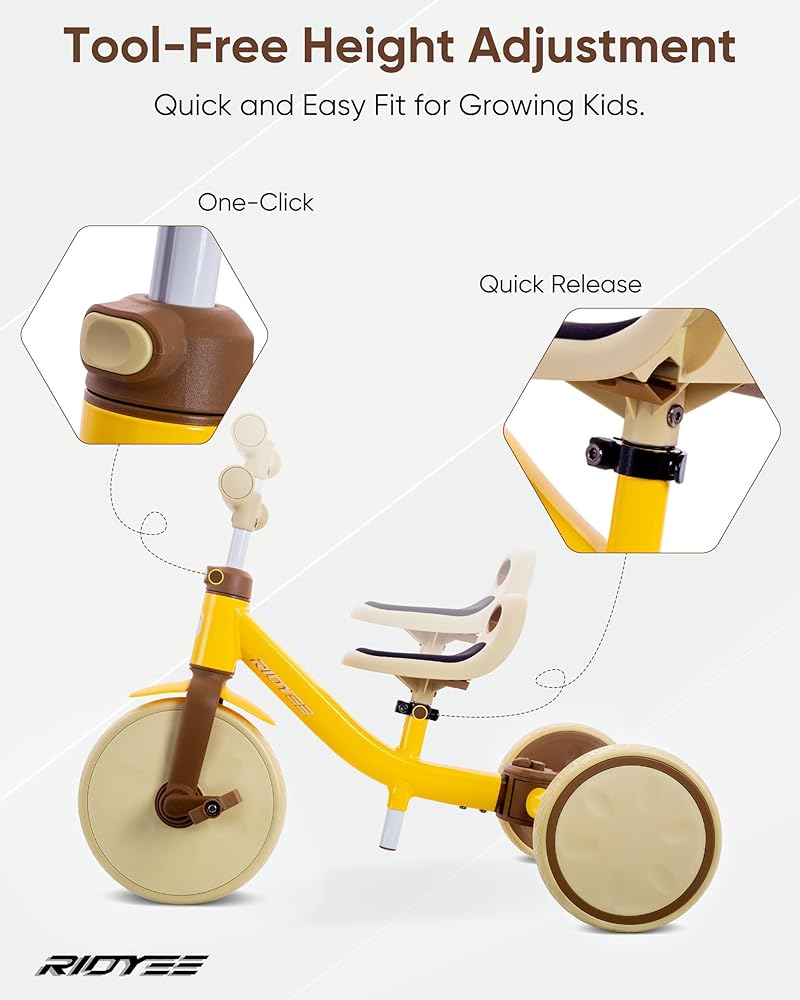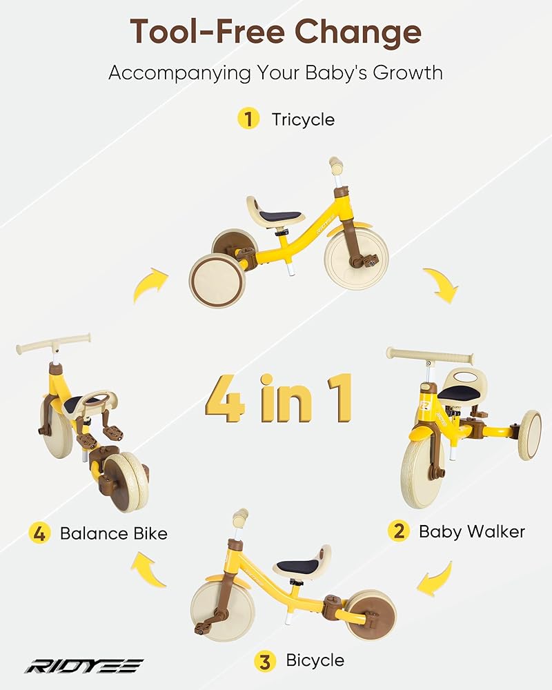 5-in-1 Versatile Tricycle for Growing Toddlers - The RIDYEE 5-in-1 Kids Tricycle is designed to grow with your child from 1.5 to 3 years old—no tools needed to switch between modes! It seamlessly transforms from a parent-controlled push trike, to a baby walker, then a balance bike, a classic tricycle, and finally into a bicycle mode for confident, independent riders. It's the perfect all-in-one gift that evolves with your toddler's milestones.