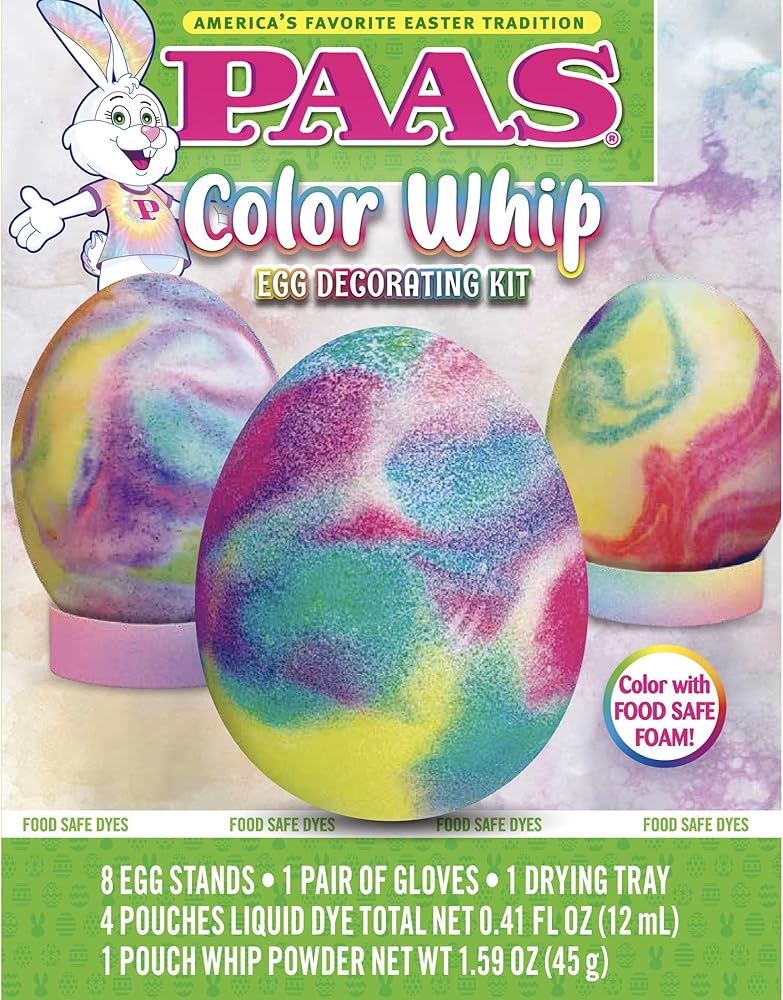 Here's a revolutionary new way to color eggs – with liquid dye and food-safe foam that you whip up in no time. Transforms ordinary eggs into colorfully swirled pieces of art with this PAAS Easter Egg Decorating and Dye Kit with Color Whip design. Each kit comes with plastic gloves, powder pouch and liquid dyes