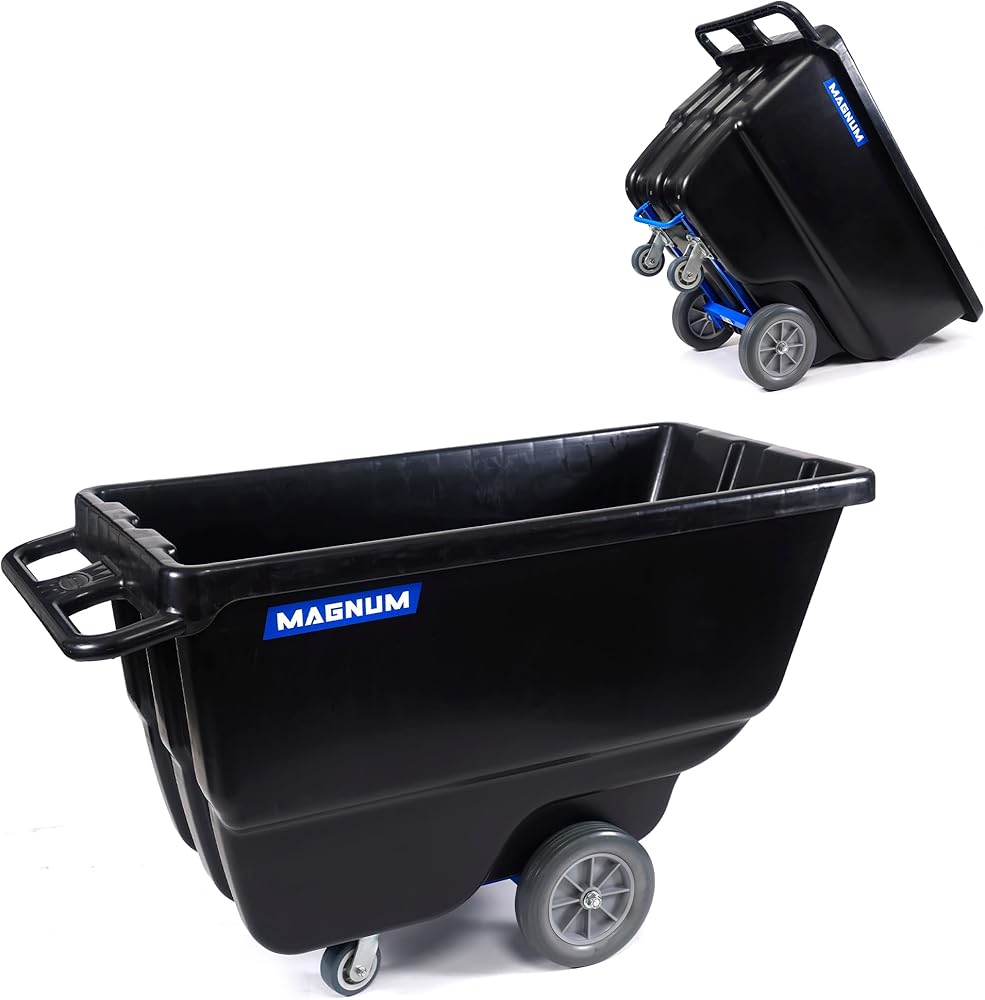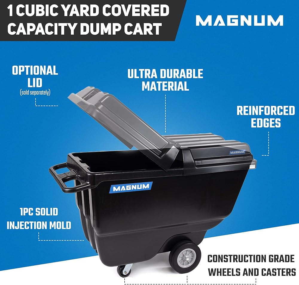 MAGNUM introduces the DUC100-12-NM 1 Cu. Yd. Covered Capacity Dump Cart with NonMarking 12” Wheels and 5” Casters, one of our many models for handling, transporting, and dumping materials on jobsites. Better than any garbage gondola, poly truck, or dumpster, our rolling dump bin, can easily transport anything from building materials and supplies to garbage and refuse using our durable, construction-grade, leakproof, OSHA compliant injection-molded polyethylene dump cart that is easy to clean, tough to damage, and resistant to dents and cracks along the edge. Unlike other 800-pound capacity tilt trucks, our tilt truck boasts exterior dimensions of 64” L x 29.5” W x 39” H, which easily fits through standard size doorways and inside elevators. Our dump carts boast interior tub dimensions of 58” L x 29” W x 32” H, which while just under 1 cubic yard (full 1 yd3 capacity if combined with the MAGNUM DUL100 dumpcart lid, sold separately), still carry comparable weight loads using a smaller, more dense dimensional profile, transporting just as much weight while easily navigating more narrow turns and pathways. The construction-grade wheels and swivel casters help this 1 cubic yard cart support up to 800 lbs. and still easily roll, turn, and maneuver.