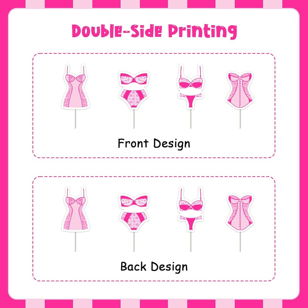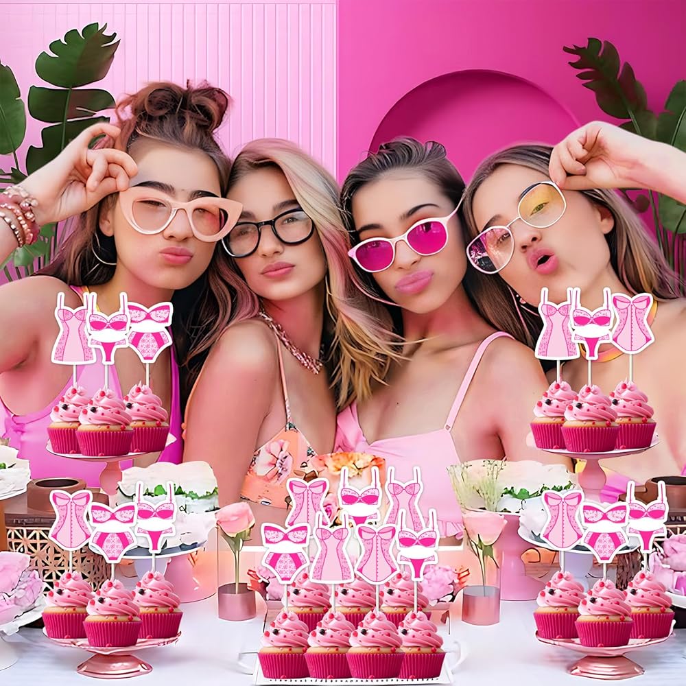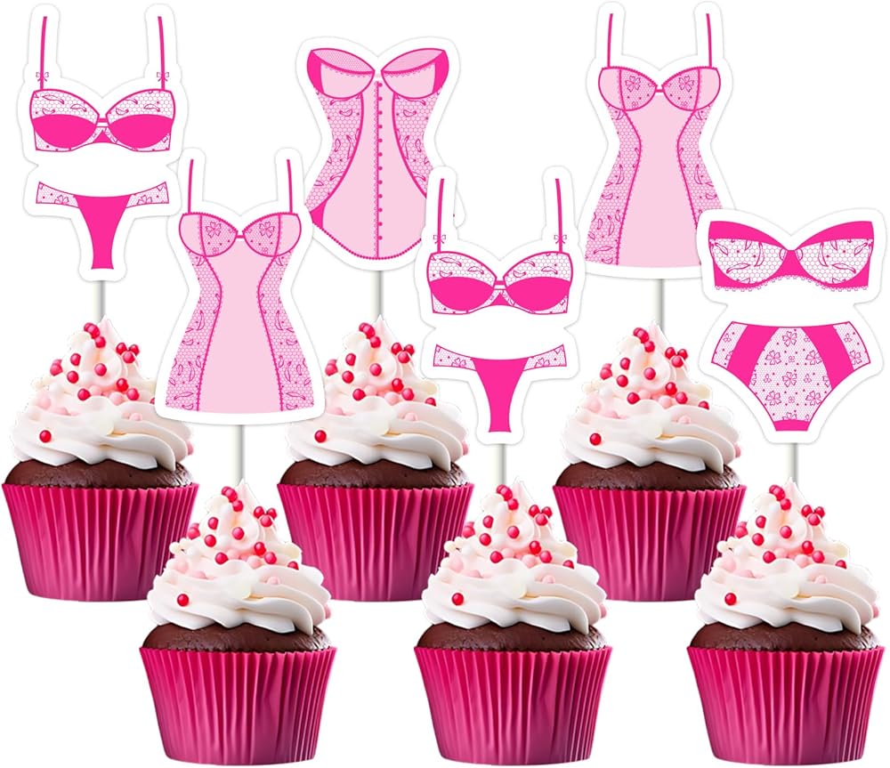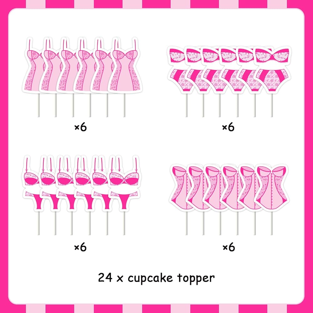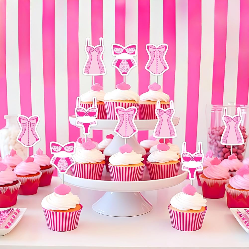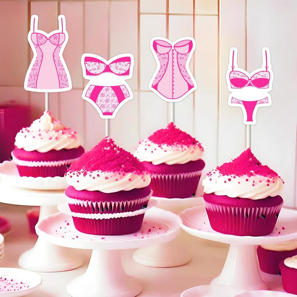 Rose Red Lingerie Themed Cupcake Toppers: Add a flirty touch to your bachelorette party desserts with our 24PCS rose red lingerie-themed cupcake toppers. These glamorous decorations are perfect for a hot pink lingerie party celebration.