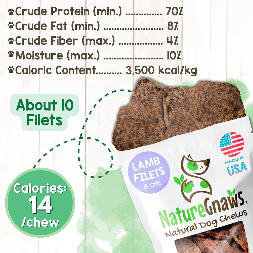 LAMB LUNG FILETS FOR DOGS - single ingredient natural premium quality lamb lung. Our Lamb Lung Filets are ideal to keep your beloved pup busy and calm. They are perfect for teething puppies and light chewers of all sizes. RAWHIDE-FREE CHEWS - Nature Gnaws USA Lamb Lung Filets are low-odor, grain-free and gluten-free, making them the perfect alternative to rawhide sticks and manufactured dog bones. NATURAL DENTAL CHEWS - Soft and savory, the natural act of chewing our Lamb Lung Chews helps reduce plaque and tartar for cleaner teeth and fresher breath. Promoting overall good dental hygiene, these natural chews for dogs will keep your pet busy and satisfied. SIMPLE, NATURAL, DELICIOUS - Our Lamb Lung chews have a savory thick texture that is the perfect reward treat to occupy and entertain. Your dog will love the natural scent and tasty beef flavor of our natural chews. NATURE GNAWS - As a family-run business, we are dedicated to providing 100% natural dog chews, bully sticks and treats made with responsibly sourced ingredients to ensure they are the best simple, natural, and delicious products for your beloved pups.