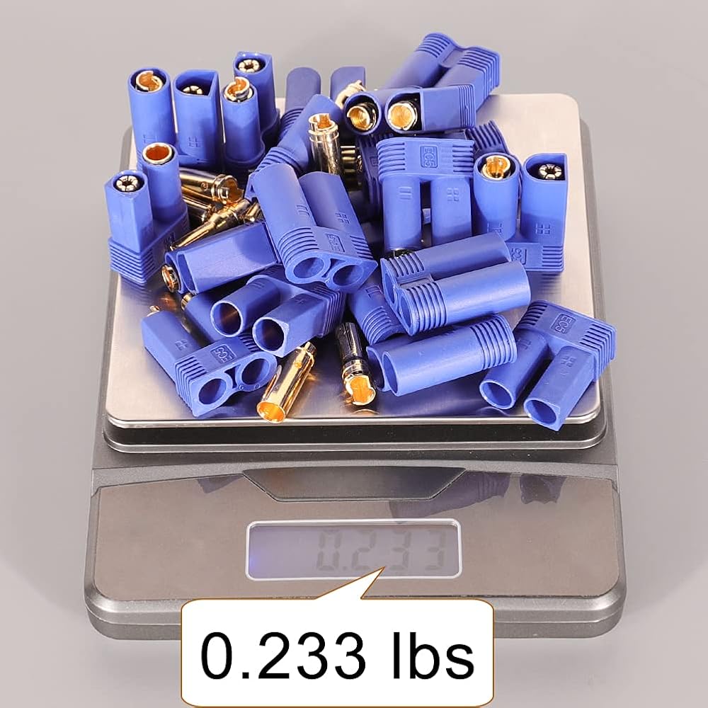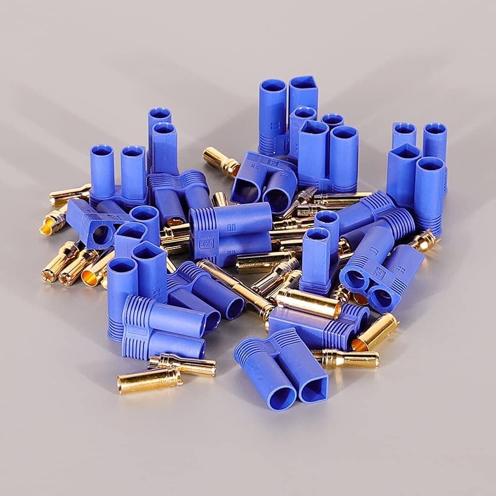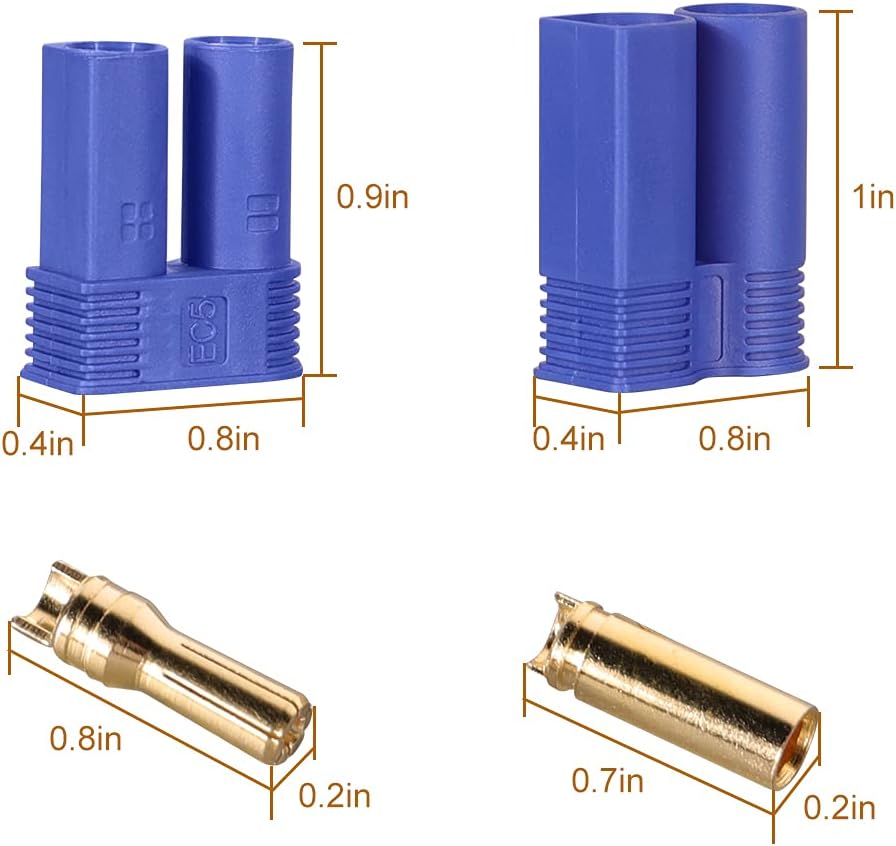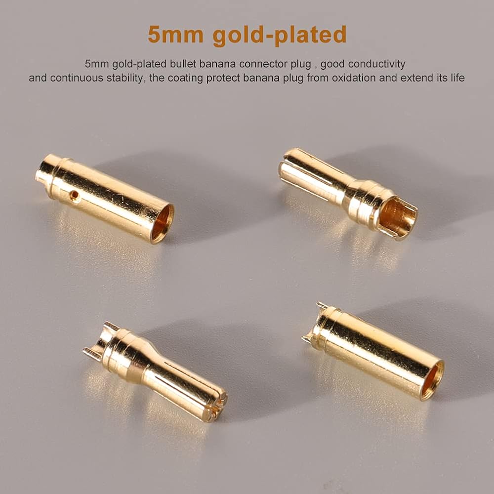 Package of EC5 Battery Connector Plugs include: 10 x Male Connectors, EC5 Banana Plug Connectors, Female Male 5.0mm Gold Bullet Connector 10 x Female Connectors 20 x Female pins 20 x Male pins