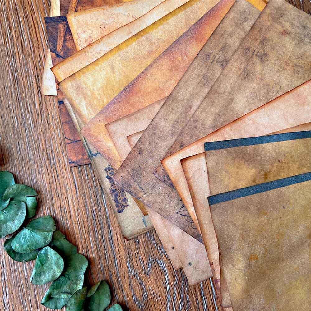 Authentic Hand-Dyed Paper – Each sheet is carefully hand-dyed, creating unique mottled patterns with rich, varied tones. The surface has a subtly uneven texture, enhancing its handmade appeal. No two pages are exactly alike, adding an authentic vintage charm to your scrapbook or journal!