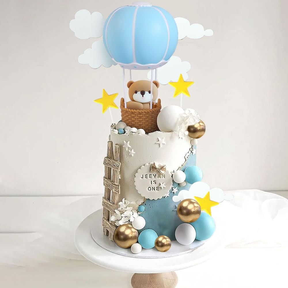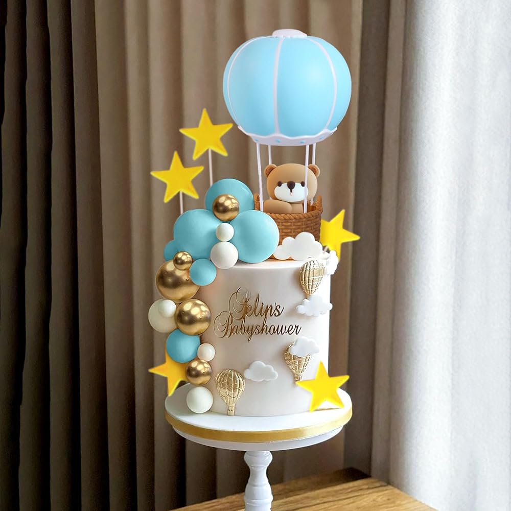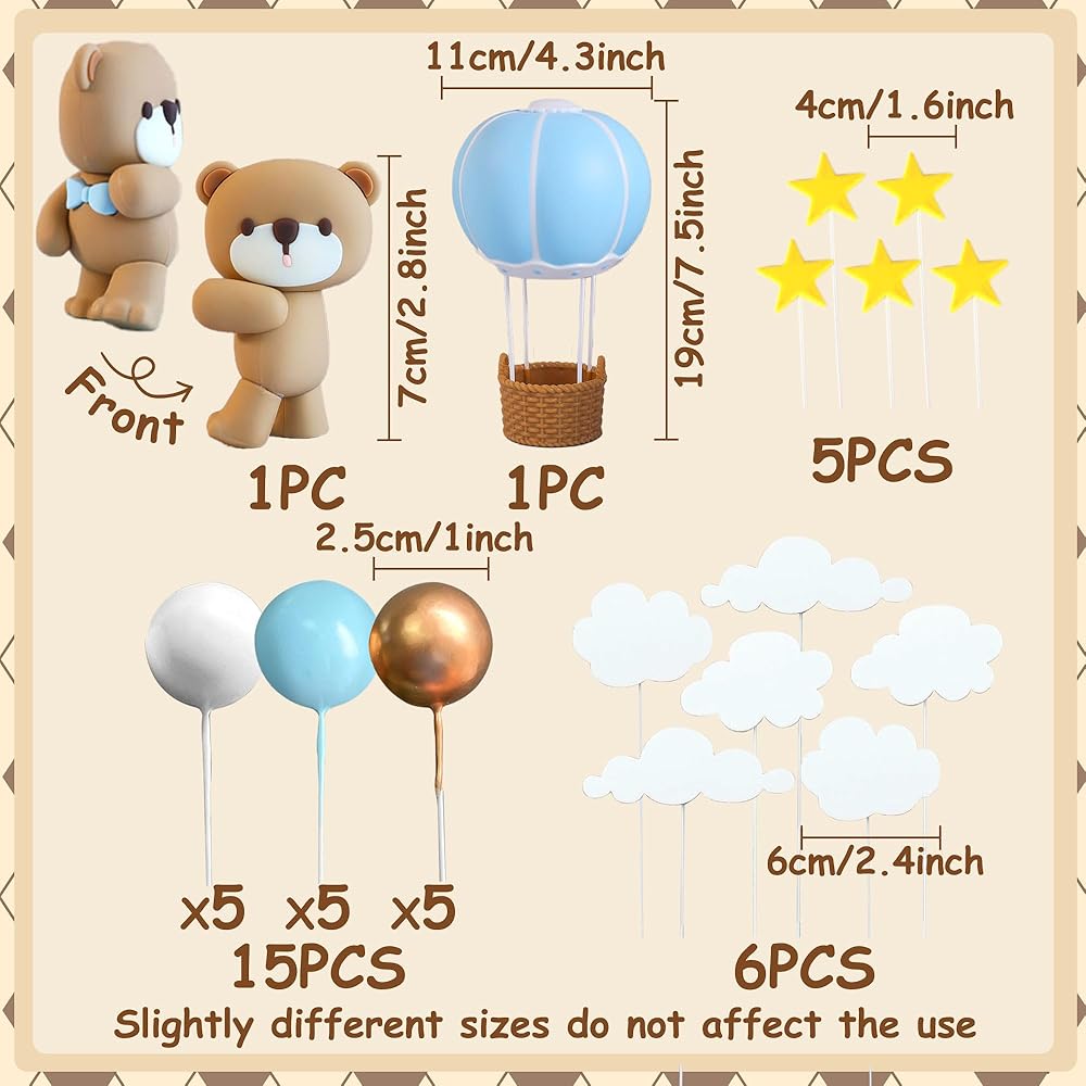 You will get: 1 x bear cake decoration, 5 x star cake toppers, 15 x cake balls, 6 x cloud cake toppers, 1 x hot air balloon. Size as picture shows