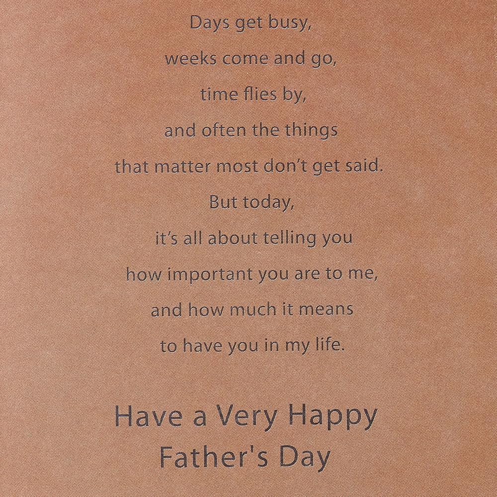 Show Dad how much you appreciate him with this Father's Day card. This heartfelt card features a pattern with brown, orange, and teal leaves. Beautiful foil accents add a touch of elegance. The meaningful message lets Dad know that even though life gets busy, it's still important to tell Dad how much he means. Envelope included.