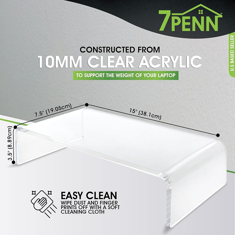 7Penn Clear Acrylic Monitor Stand Riser for Home Office - 15 Inch Desk Computer Screen Stand for Elevating Eyeline - Posture Enhancing Riser for Desktop Display - Clean Modern Desk Accessory