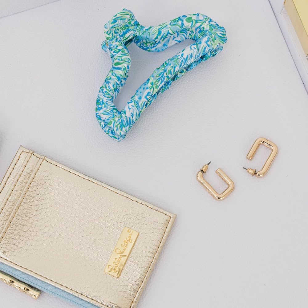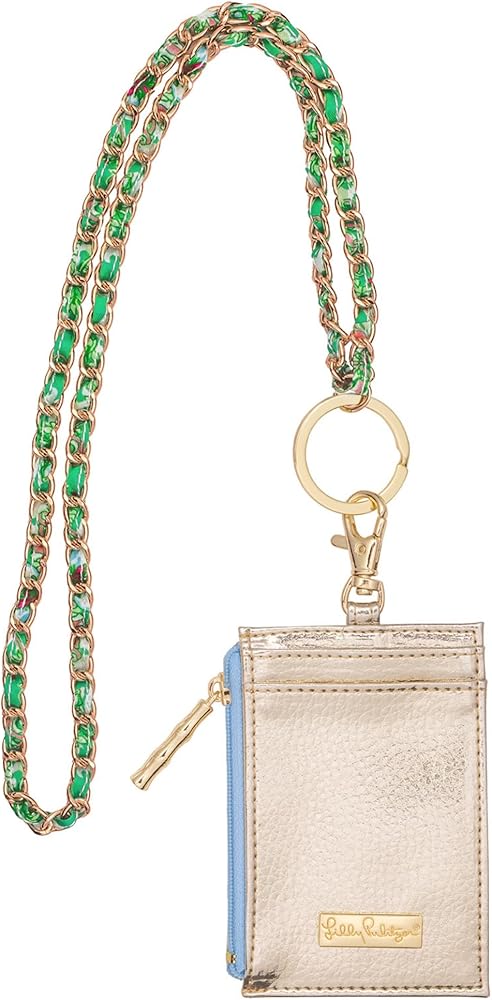Lanyard features the pattern, Blossom Views, threaded through gold chains for the perfect balance of ease and glamour. Mini wallet is featured in shiny gold and has a Lilly logo plaque on one side