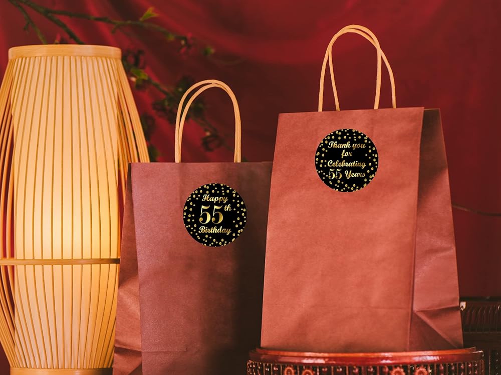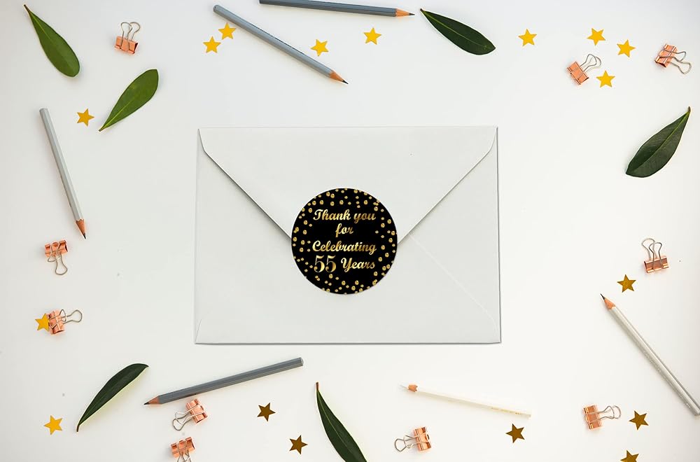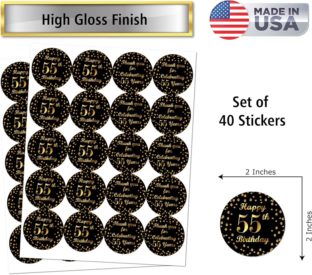 55th Birthday Round 2 Inch Big Glossy Stickers, Thank You for Celebrating 55 Years Black and Gold Labels, Great for Party Favors, Decorations, Tags, Gift Bags and Supplies. Made in USA