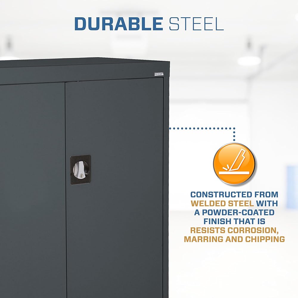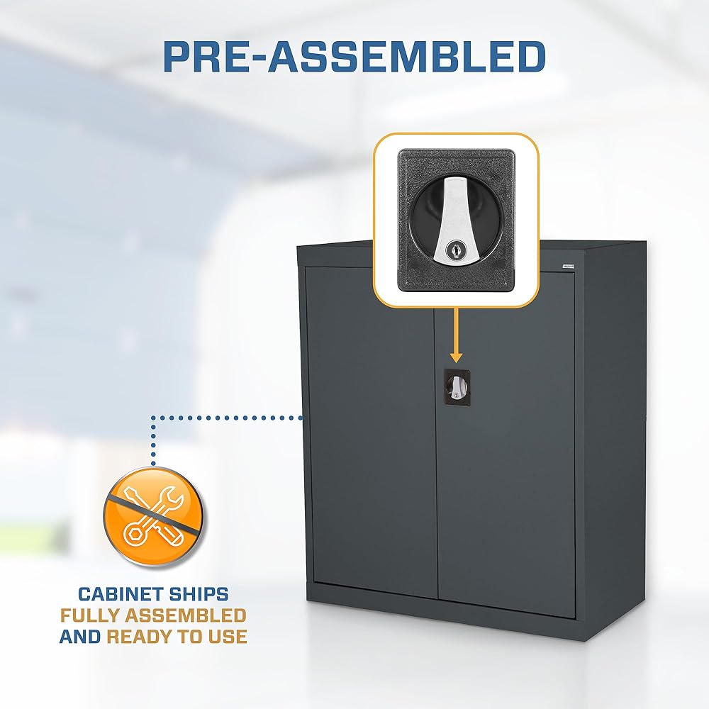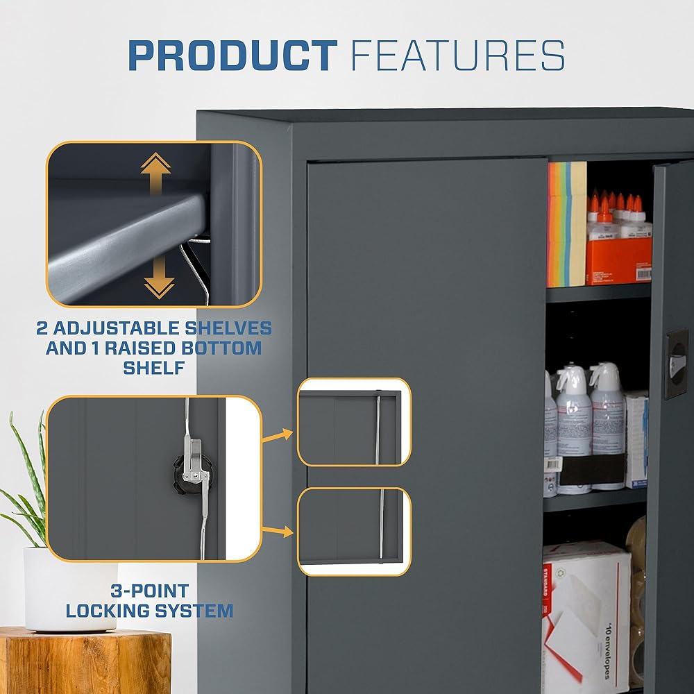 ADJUSTABLE SHELVES: Our metal storage cabinet features two fully adjustable shelves on 2-inch centers, along with a raised bottom shelf, allowing you to customize the space to fit your specific needs