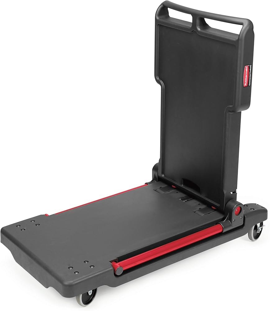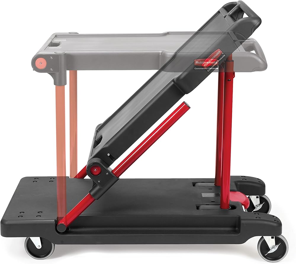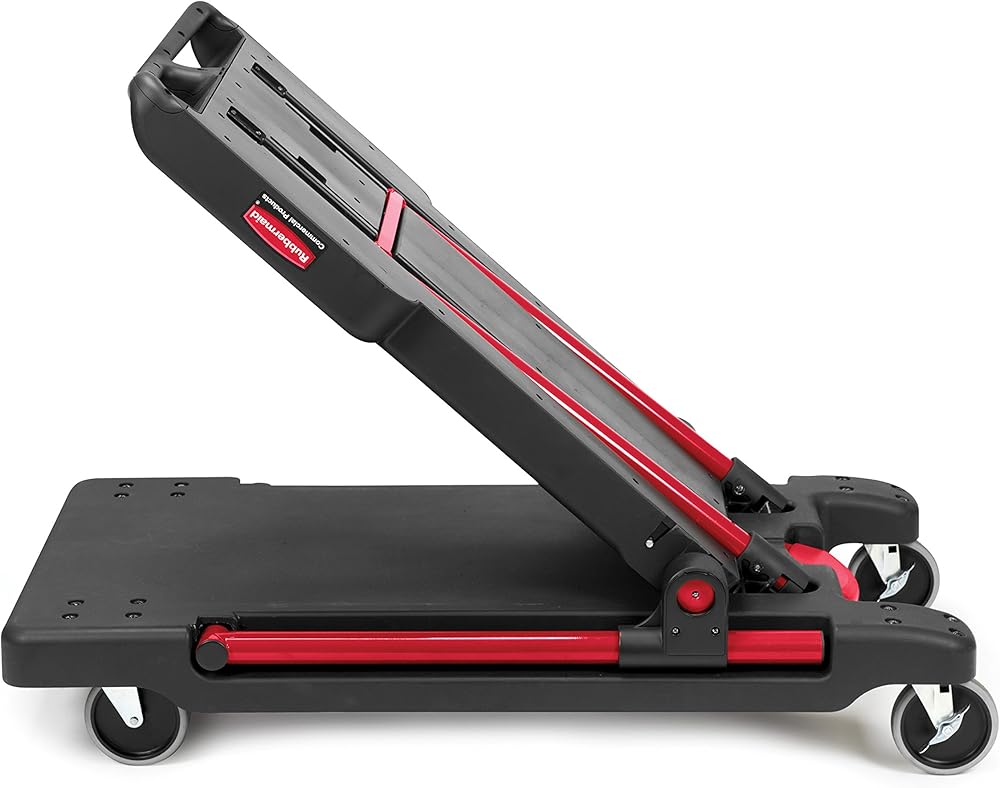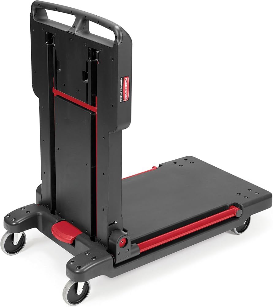 The Rubbermaid Commercial Convertible Utility Cart is ideal for moving large, heavy loads in almost any environment. Design converts from a utility cart to a platform truck in just seconds. Multifunctional productivity with improved worker well-being saves you time and money. Push buttons depress to easily convert from cart to platform truck, and foot pedal depresses to fold cart for storage. Rear wheel locking casters keep cart safely in place while loading and unloading. Ergonomic handle designed for comfort. Recessed top helps retain items on shelf during transport. Extended deck makes loading the lower shelf easier. Narrow profile easily navigates through doorways and hallways. 400 lb load capacity.