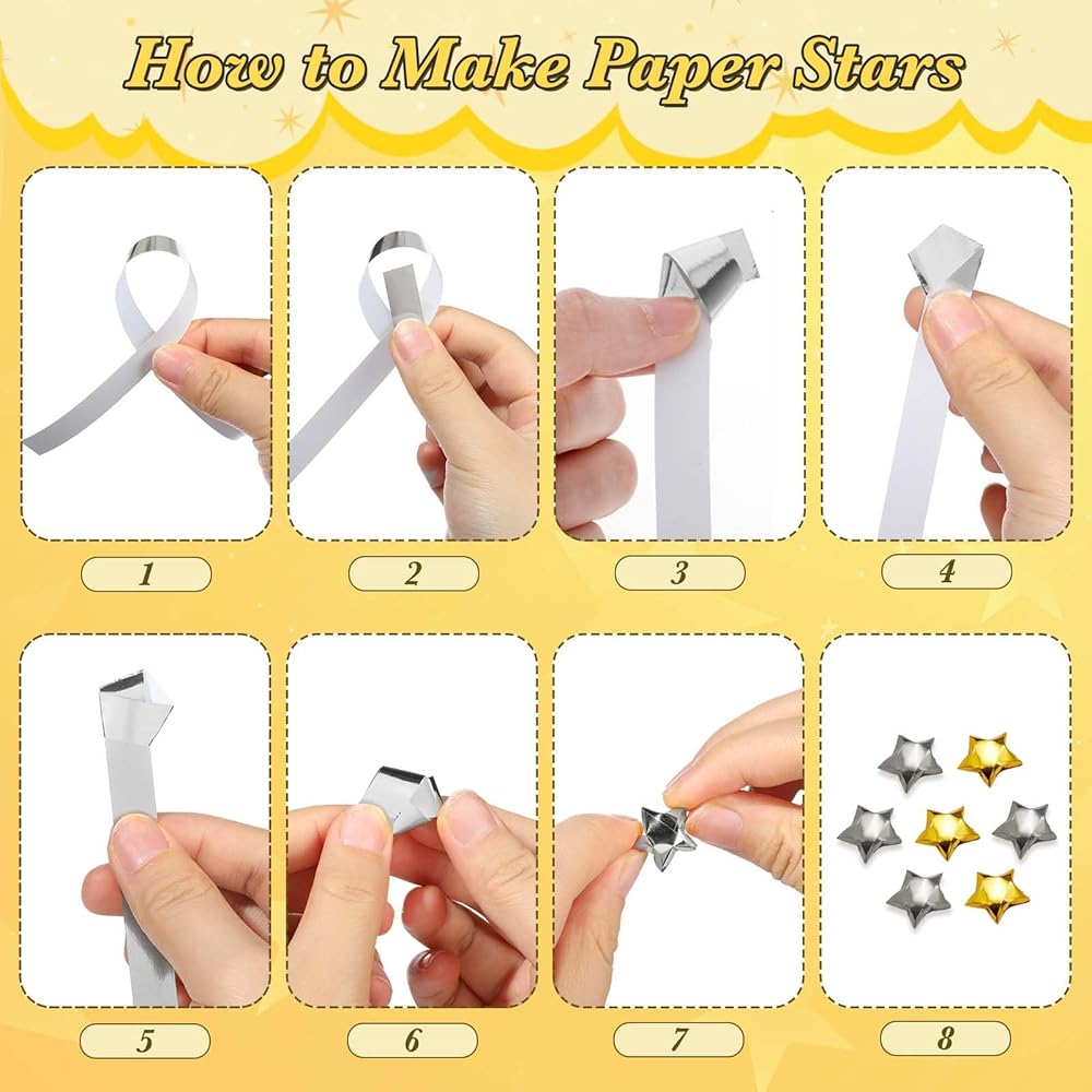 Whether you are creating table centerpieces, window displays, or adding a sparkly accent to school crafts, these star folding paper strips will add a festive touch.