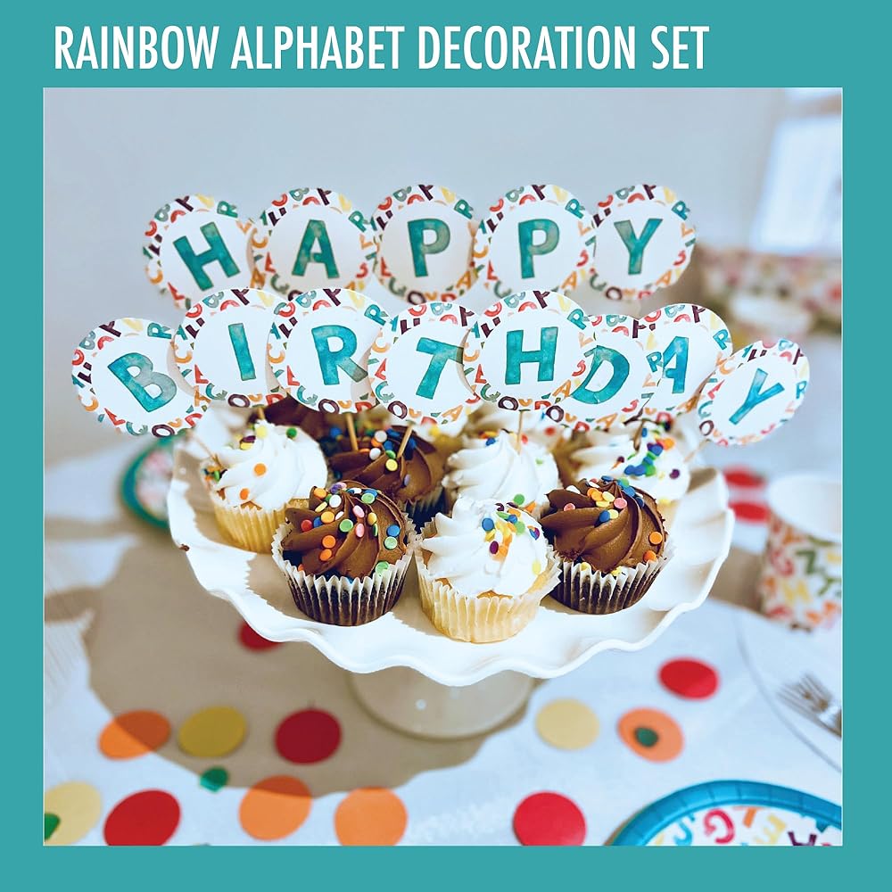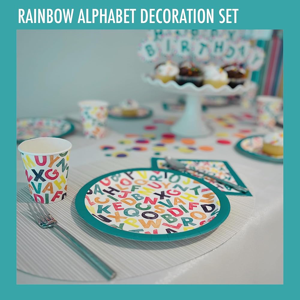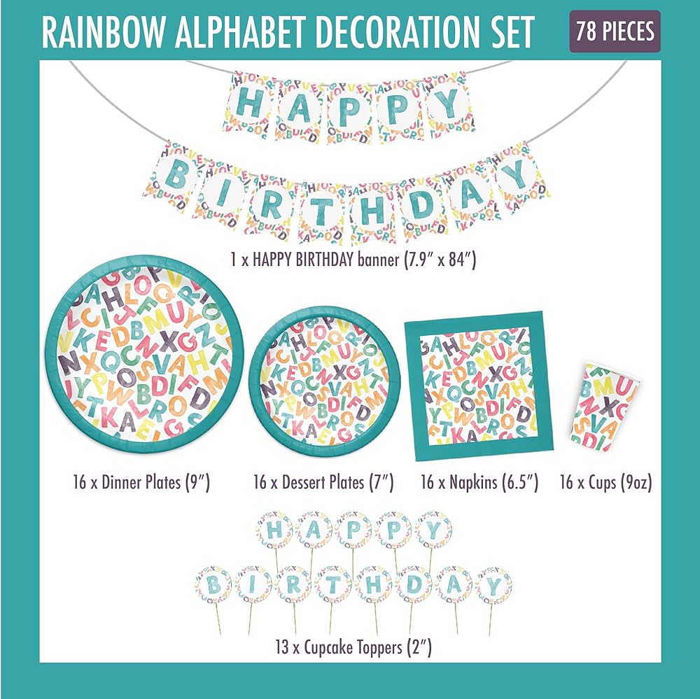 **Complete Alphabet Watercolor Birthday Decorations** These are the ABC rainbow party decorations with 16 dinner plates (9in), 16 dessert plates (7in), 16 alphabet napkins (6.5in), 16 cups (9oz), 13 cupcake toppers and a ABC-themed rainbow HAPPY BIRTHDAY banner.