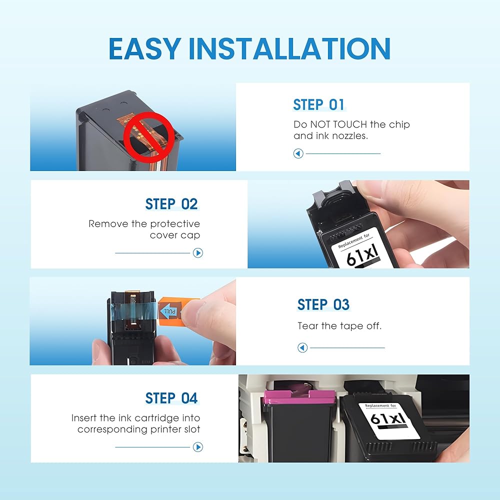 Package Contents: 2 Pack of 61xl Remanufactured ink cartridges black and tri-color combo pack replacement for HP 61XL ink in a box. 1*61XL black ink cartridges, 1*61XL tri-color ink cartridges.