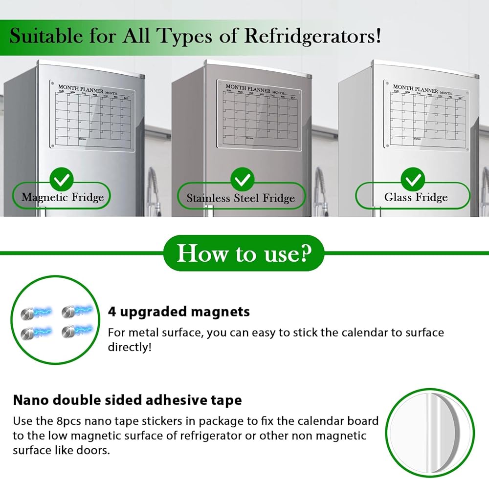 💎【Real Organic Acrylic】The acrylic magnetic calendar for fridge is made of REAL organic acrylic material, which is glass-hard, High transparency. High-quality material ensure the magnetic calendar for refrigerator is durable and smooth surface, it's easy to write down and clean.
