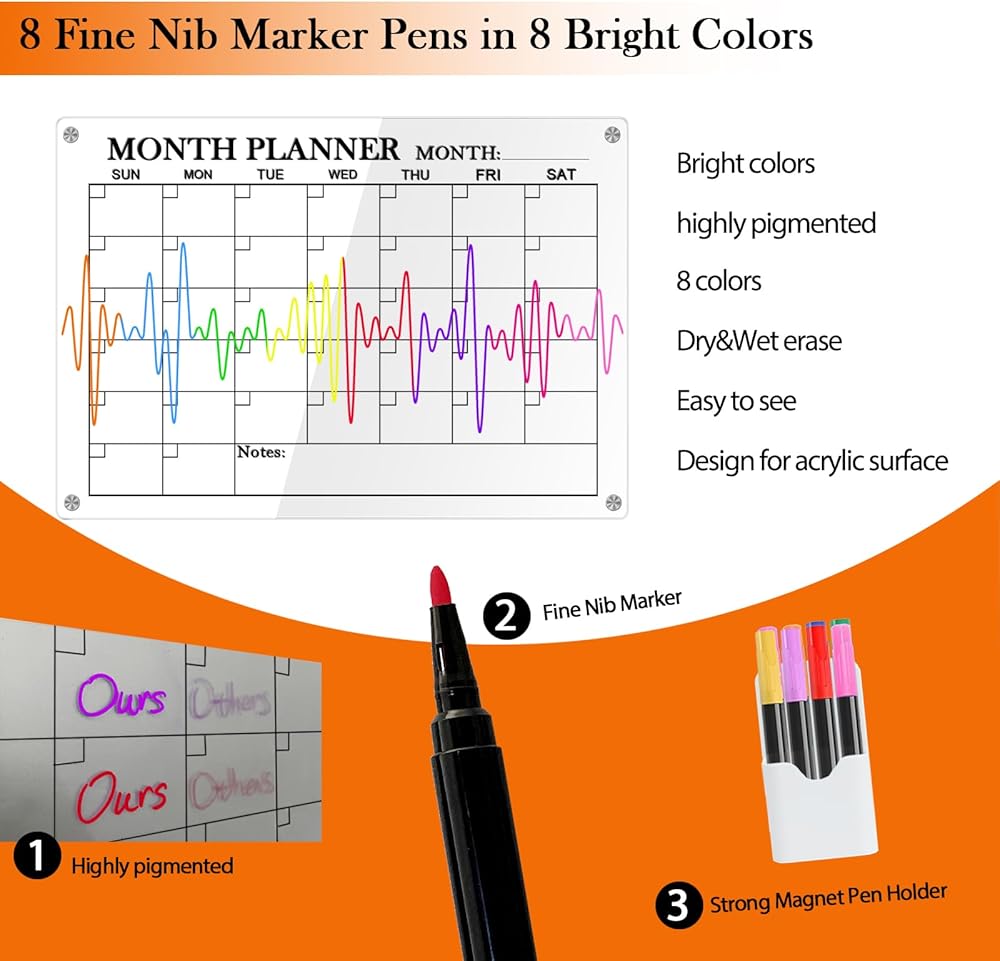 ✍【Special Design Markers】This acrylic magnetic calendar for fridge comes with 8 markers in 8 different vibrant colors, the markers are specially designed for smooth surface like acrylic board. Fine nib & High pigmented, are writing smoothly and easy to see. You can wipe it off easily with cloth, tissue without leaving marks or ghosting.