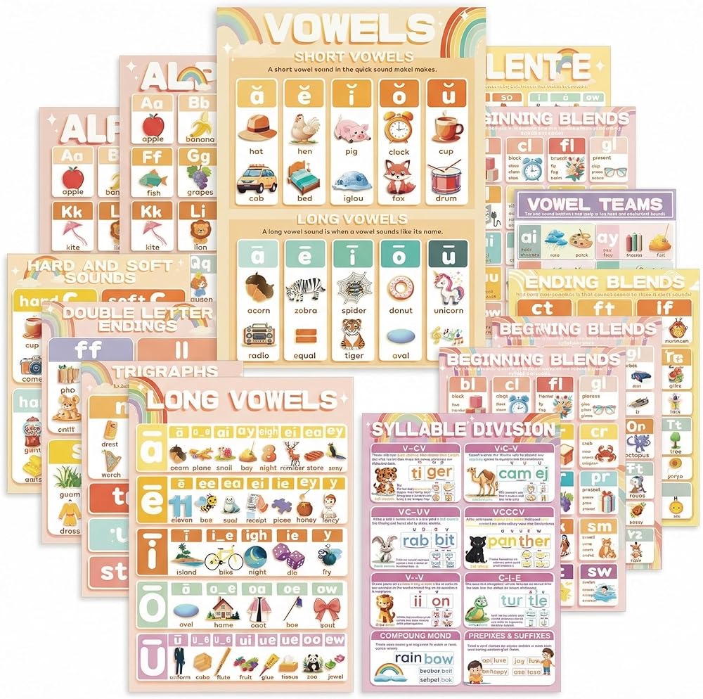 HOOKED ON PHONICS: Designed for teachers, parents, and homeschoolers, these phonics posters are a must-have for creating an engaging sound wall or phonics display. They help students master vowel sounds, blends, and syllable rules in a visually appealing way
