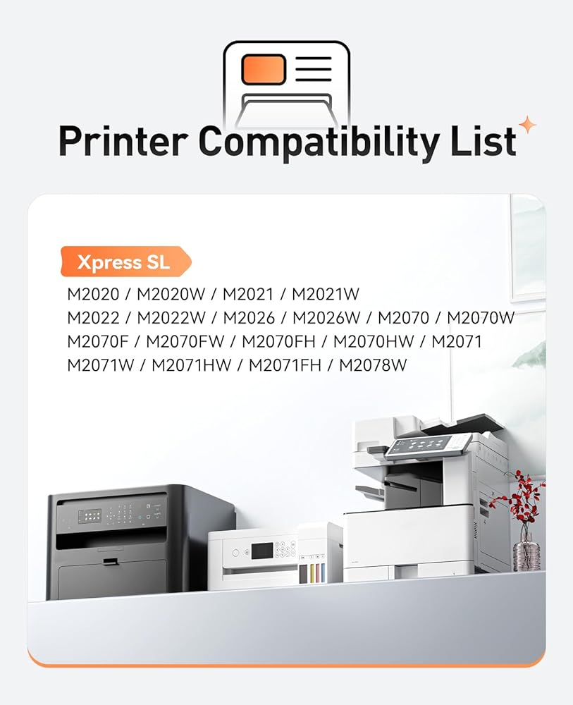- Compatible Printers: Samsung Xpress SL Series M2020 M2020W M2021 M2021W M2022 M2022W M2026 M2026W M2070 M2070W M2070F M2070FW M2070FH M2070HW M2071 M2071W M2071HW M2071FH M2078W printer
