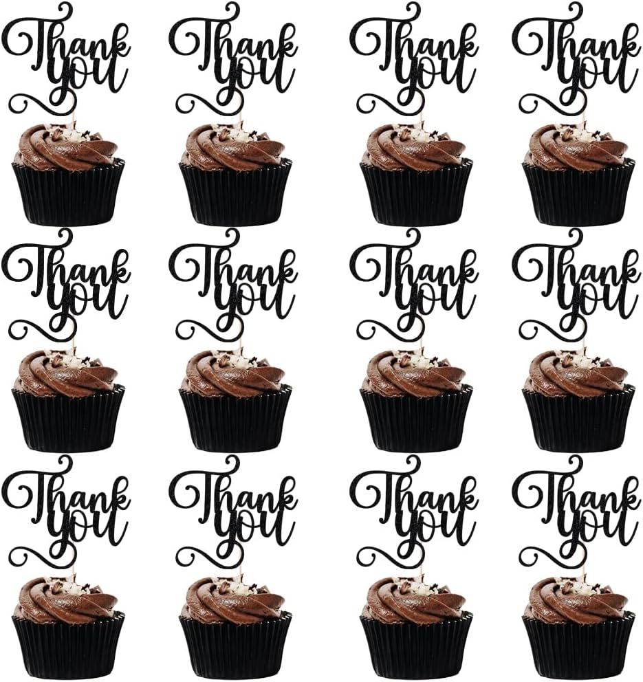 12 Pcs Thank You Cupcake Toppers,Glitter Thank You Cupcake Picks for Birthday Wedding Decorations,Happy Thanksgiving Day Baby Shower Kids Birthday Party Anniversary Party Supplies Black