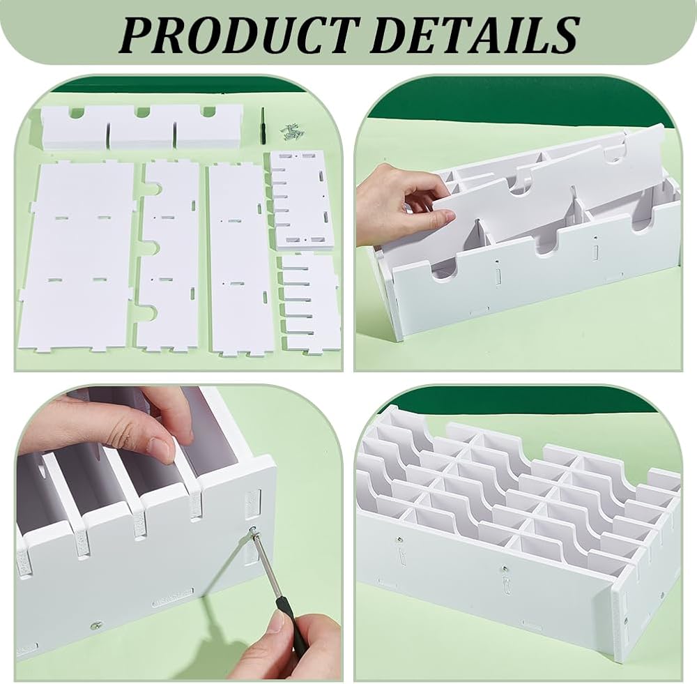 Multifunctional: The finger slot cut in each divider makers removing the ink pads easily and the dividers can be taken out for storing larger accessories. 5/7mm thick PVC foam board, easy to clean. Sturdy and durable. Simple assembly is required.