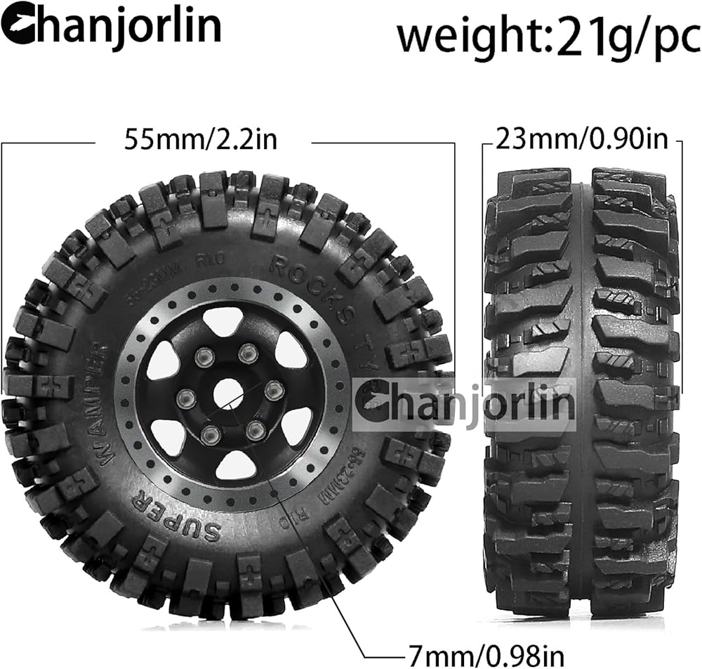 ✔Size of 1.0 rock crawler tires are outer diameter(height): 51 mm (2.0 in),inter diameter: 23 mm (0.9 in),width: 20 mm (0.79 in).For the perfect balance of Scale looks and performance.This rc 1.0 tires are definitely compacter than other 1.0 mud tires,but they do not rub up against the body.