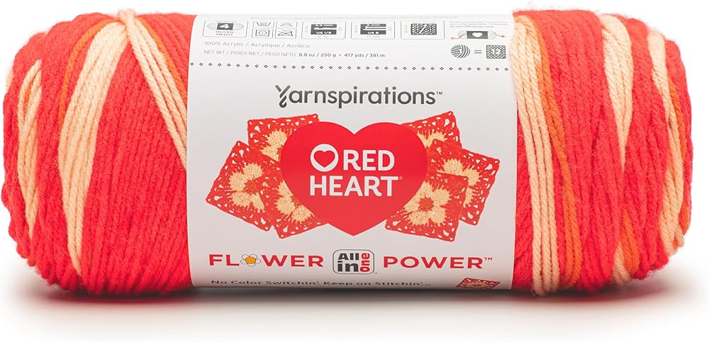 Crochet flower motifs bloom effortlessly with Red Heart All-in-One Flower Power yarn—no switching colors or green thumb needed! This innovative yarn is specially engineered to crochet continuous flower motifs as you stitch. Each ball makes up to 12 motifs. The finished motifs can be combined into an endless number of projects from blankets to cardigans to fashion accessories. Each ball of this 100% acrylic yarn contains 8.8 ounces (417 yards) of worsted weight yarn in a range of self-patterning colorways. It is machine washable for easy care and perfect for blankets, cardigans, tote bags, scarves, fashion accessories, and more. Imported. 100% acrylic, #4 worsted weight yarn. 8.8 oz/250g/417 yd/381m ball. Machine washable. Imported. Crochet gauge, size I-9 (5.5mm) hook: 12 sc and 15 rows = 4" (10.2cm). Knit gauge in st st, size 8 (5mm) needles: 17 sts and 23 rows = 4" (10.2cm).
