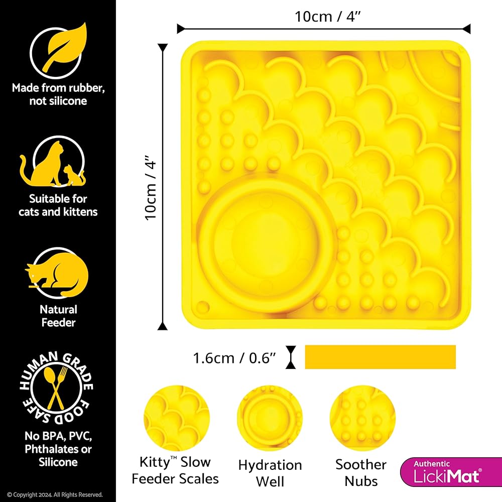 Based on LickiMat Felix and Casper design with Raised Edges and Multiple Feeding Surfaces to Enrich Mealtime and Treats for All Food Types. Hydration Well Micro Dish to Support Your Kitten's Hydration (Bone Broth, Cat Cream, Other).