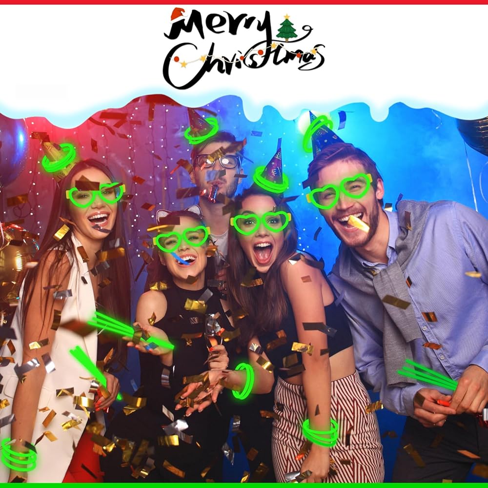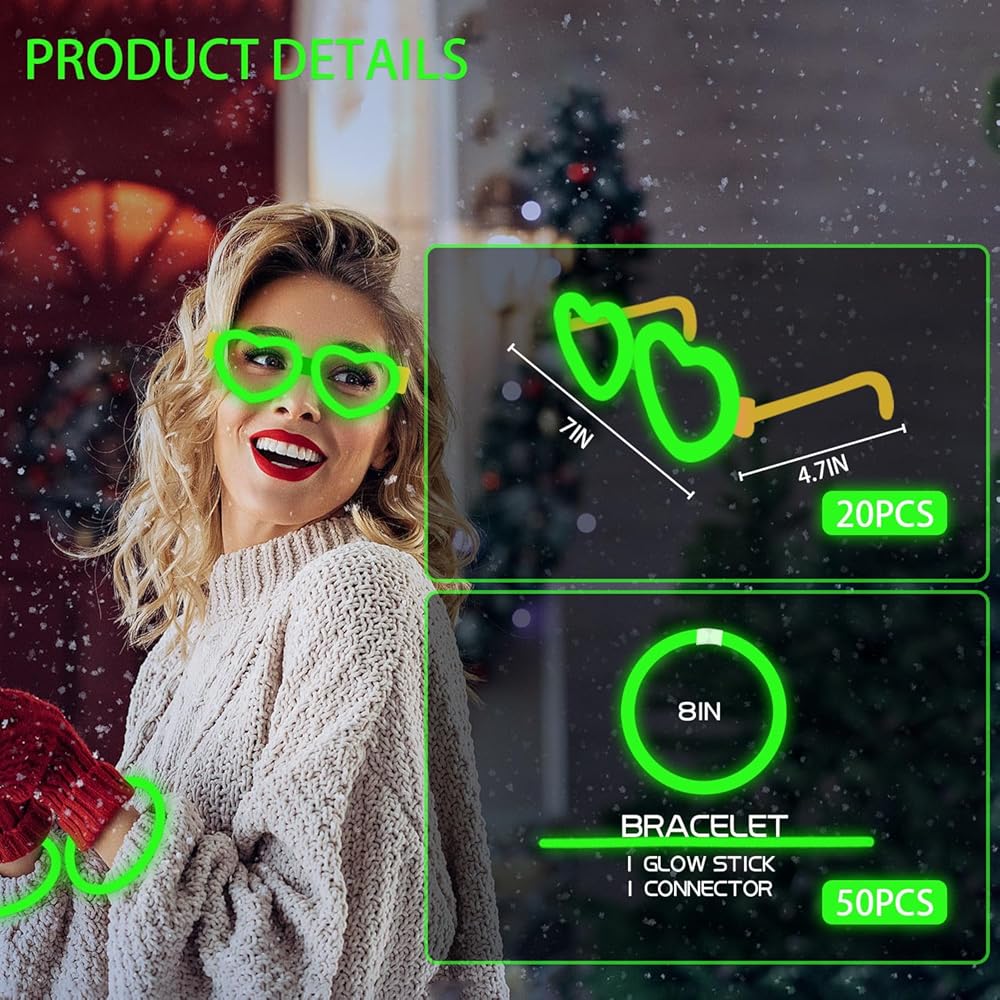 【Christmas Party Favors】20Pack heart shape glow glasses and 100pcs white glow sticks with 100pcs connectors are included in package.You can assemble 20pcs glow heart glasses,and the rest 60pcs sticks can be make to 60pcs bracelets or 30pcs necklace,enough quantities glow glasses sticks are ready well for your vibrant party.