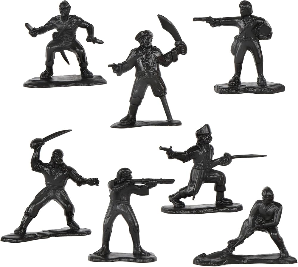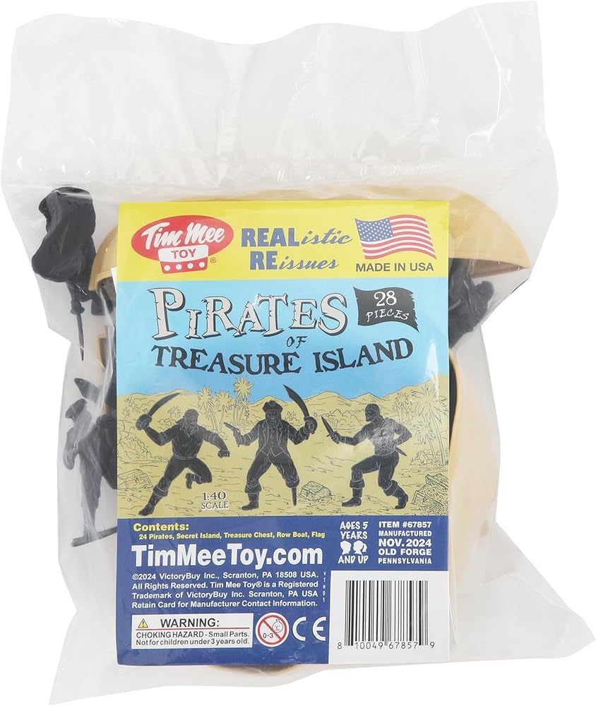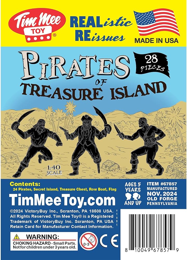 The Tim Mee Toy Pirates of Treasure Island are ready for your swashbuckling adventures on the high seas. This 28 piece Set of is proudly manufactured in the United States, and includes 24 pirate figures in 7 poses for maximum play value. Also includes a pirate flag, row boat, Secret Island, and a Treasure Chest. The buccaneers stand up to 2 inches tall with medium detail, some flashing and are approximately 1:40 scale. The figures are made from slightly flexible Red color LDPE plastic and accessories are made from Brown color HDPE plastic. The Island measure 6.25 x 5.75 x 3 inches tall and features a removable top that reveals a perfect spot to hide the treasure chest or use as a defensive position. The treasure chest measures 2 x 1.25 x 1.25 inches tall with a removable lid. The wooden rowboat is 6.75 inches long includes 2 oars and bench seats.