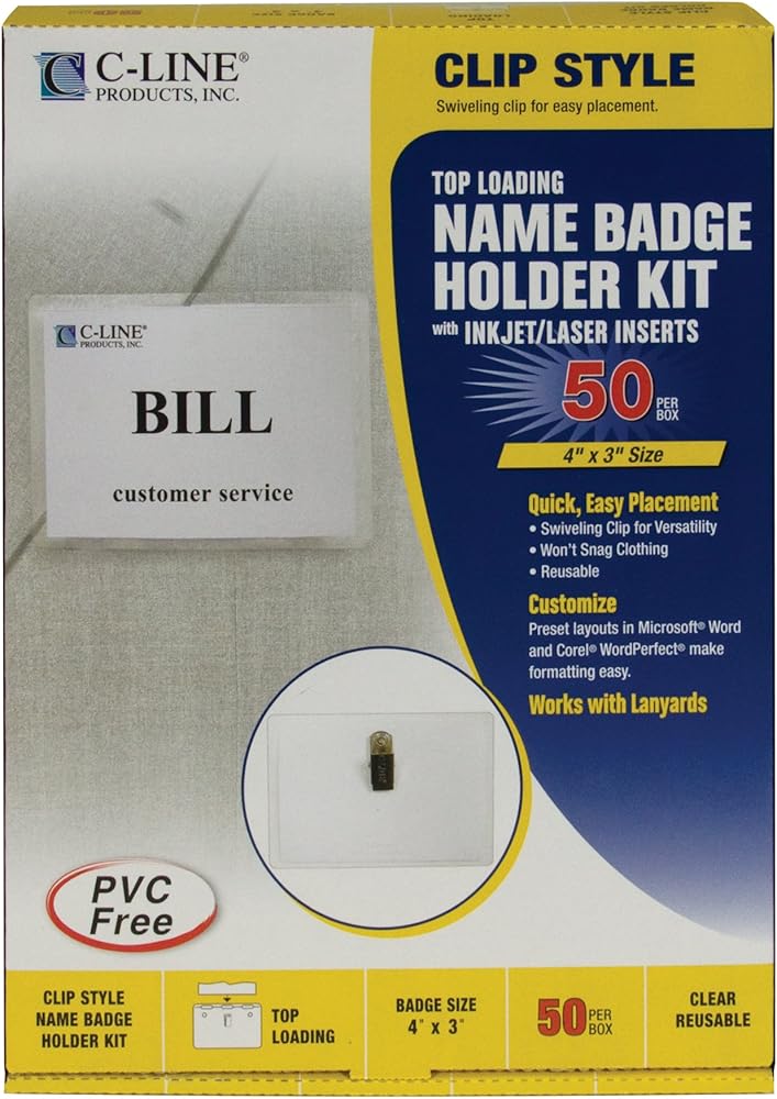 Badge Holder Kit contains reusable, clear vinyl holders with clips; white 8-1/2" x 11" microperforated sheets and printer instructions. Badge holder does not use pins or adhesives. Instead, it uses a swiveling clip that allows the wearer greater versatility. 8 mil thick badge holders are top-loading and made of PVC-free plastic. Insert sheets are compatible with laser and inkjet printers.