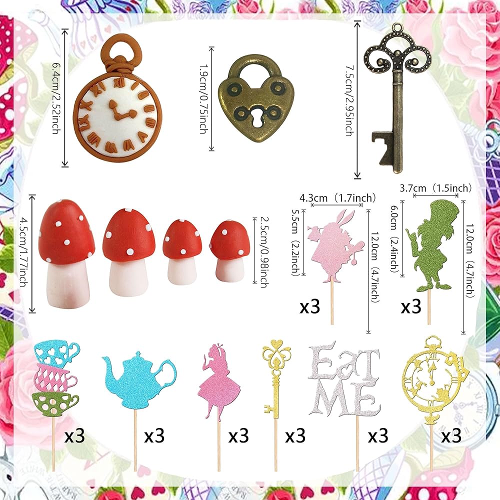 - What you will receive:1 x clock, 1 x heart lock, 1 x key, 4 x red mushrooms, 24 x Alice themed cake topper.