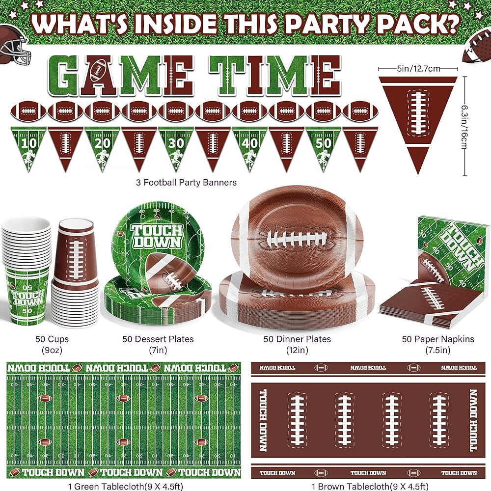 Ultimate Football Party Supplies Set: Ecomore 205PCS football party decoration and Disposable Dinnerware Set has everything you need to host an exciting & hassle-free party for up to 50 guests! The Football Party Supplies Set Football-themed Birthday Football Game Day Party Decor includes: 50 x 12" Football Plates, 50 x 7" Dessert Plates, 50 x 9Oz Football Cups, 50 Football Napkins, 2 Football Tablecloths (9X4.5ft), 3 Football Flag Banners: Each banner contains 10 flag panels (5"x6.3" per panel)