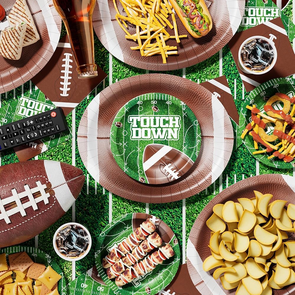 Ecomore 205PCS Football Party Decorations (Serves 50), Easter Decoartion Football Birthday Party Supplies with Disposable Paper Plates and Napkin Cup Banner Touchdown Tablecloth Graduation Party Decor