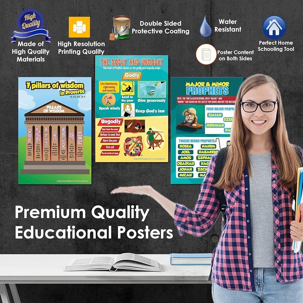 PERFECT RELIGIOUS WORSHIP SUNDAY SCHOOL EDUCATIONAL POSTERS – Learning posters for home school teaching and parent's educational teaching material – Included in this set are 6 posters with front and back designs – each poster contains inspiring religious subjects for kids to strengthen their Christian faith.