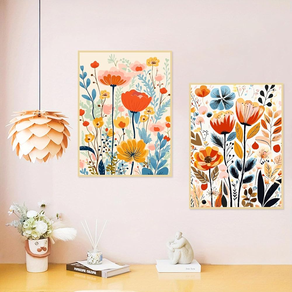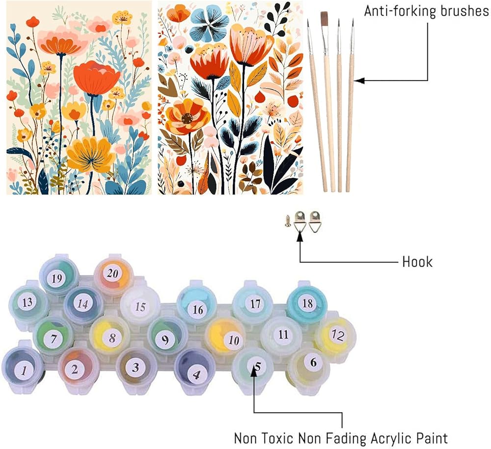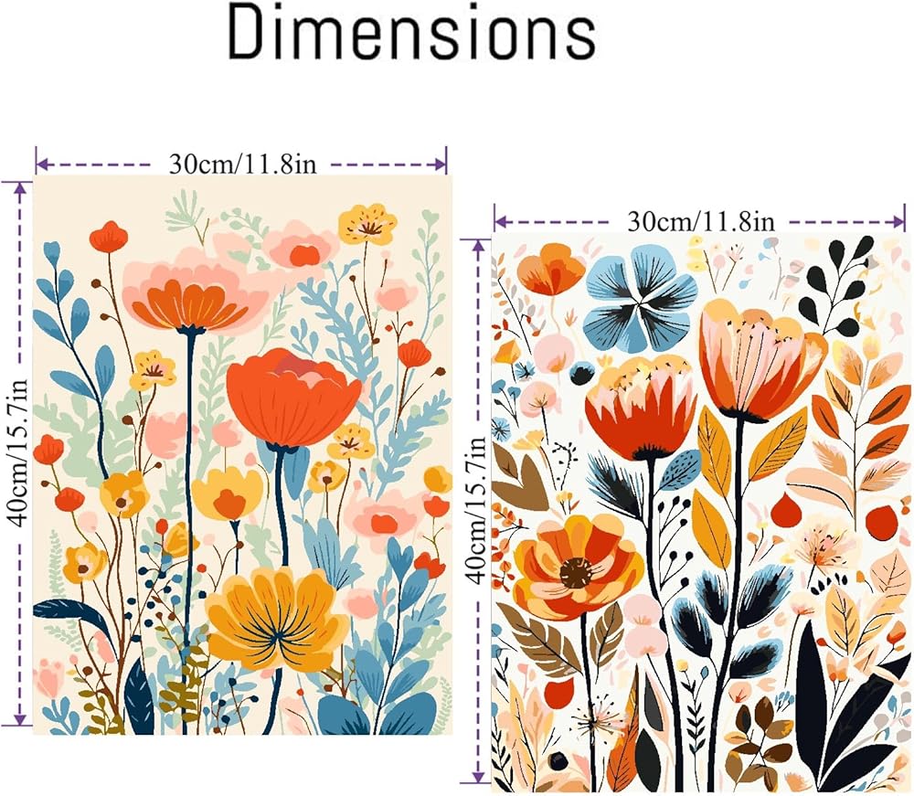What you will get: Easy flower paint by numbers kit for adults beginner 2 pre-printed cotton and linen canvas (without frame), 2 set of acrylic paint, 8 pcs wooden brushes,2 paper copy of numbered canvas for reference,1 colorful box, paint by numbers on canvas size:12” x 16”