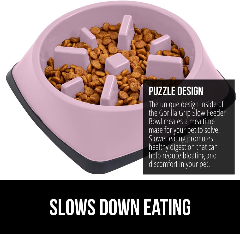 Engaging Design: custom Gorilla Grip design requires pets to navigate the built in features and obstacles to help keep your pet engaged in mealtime; pro tip, freeze treats in the bowl to create a fun puzzle for your pet to solve