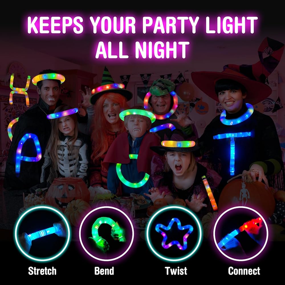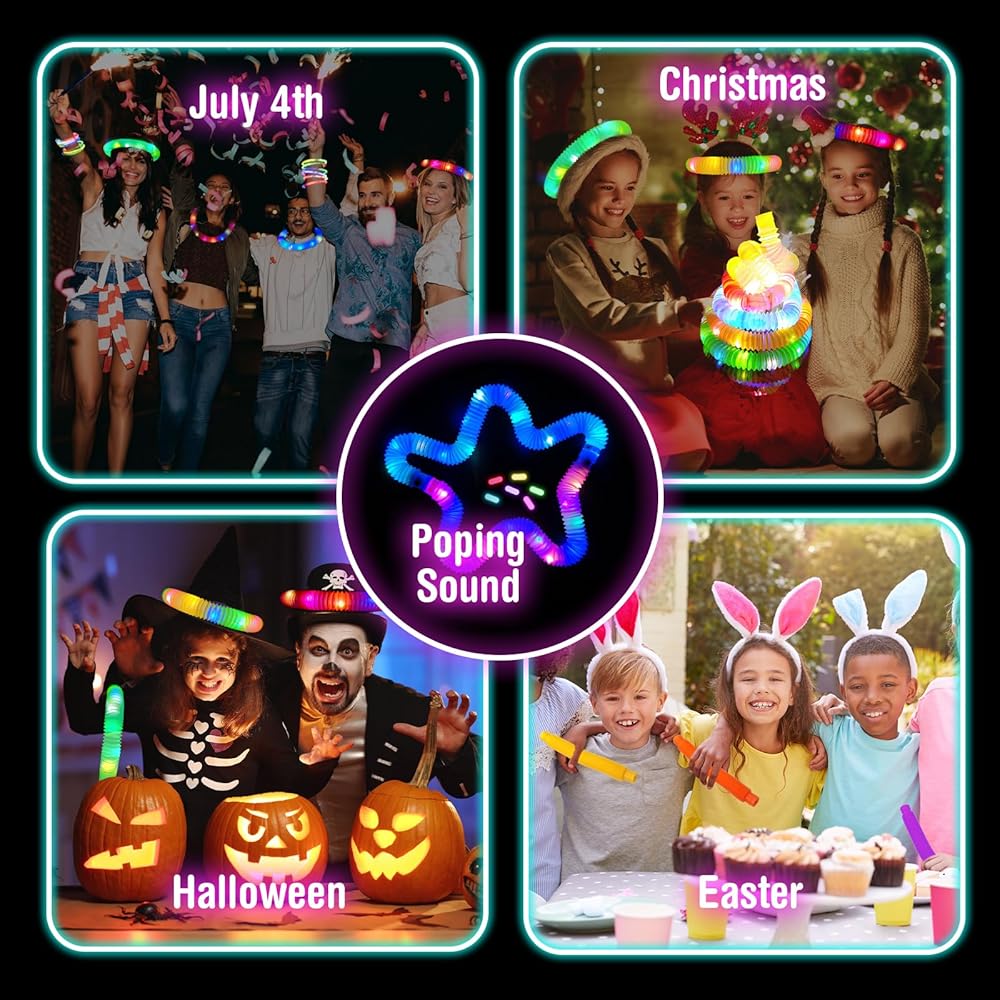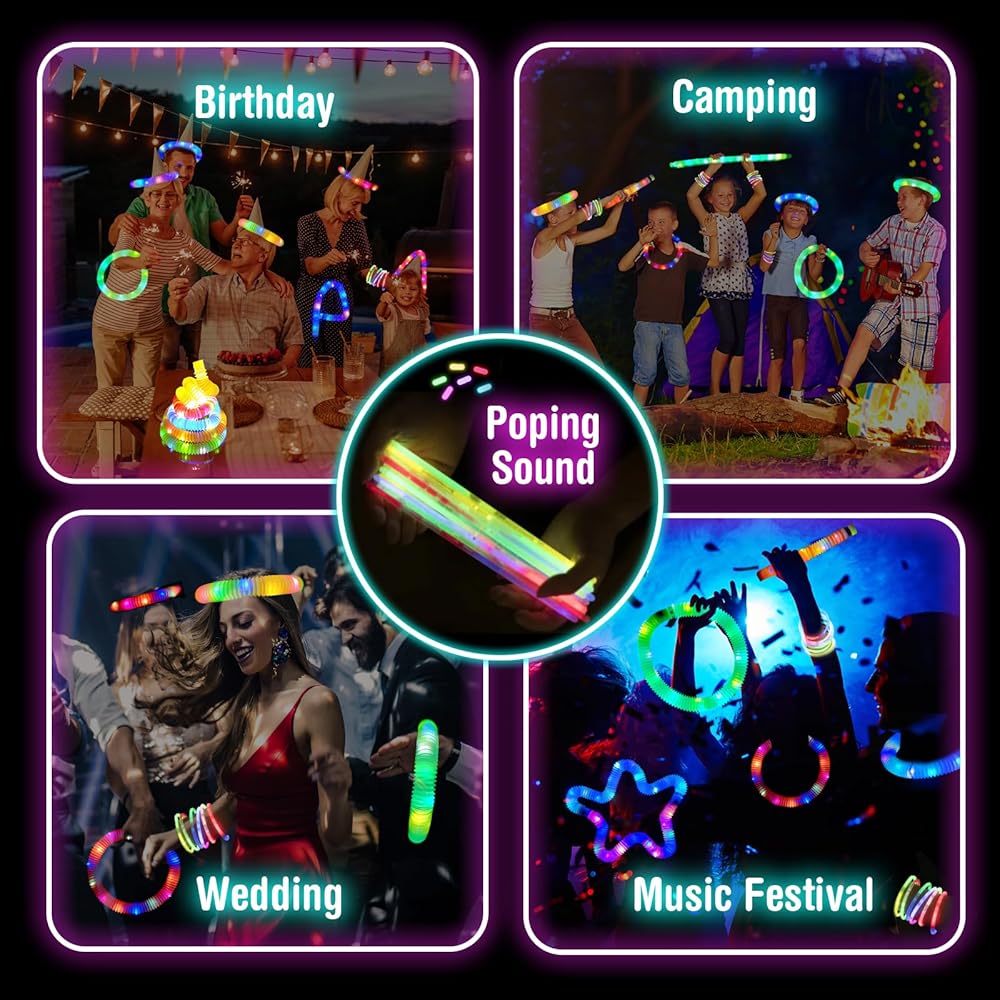 🌟Customizable Designs: The glow sticks are easy to bend and connect at the ends to create fun accessories like bracelets, necklaces, or even crowns. The LED pop tubes stretch, twist, and retract while making amusing sounds, adding even more fun to the mix. Together, these glow sticks and tubes are perfect for hands-on play and creating your own glowing accessories.