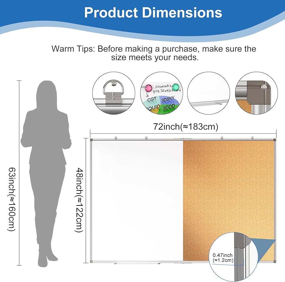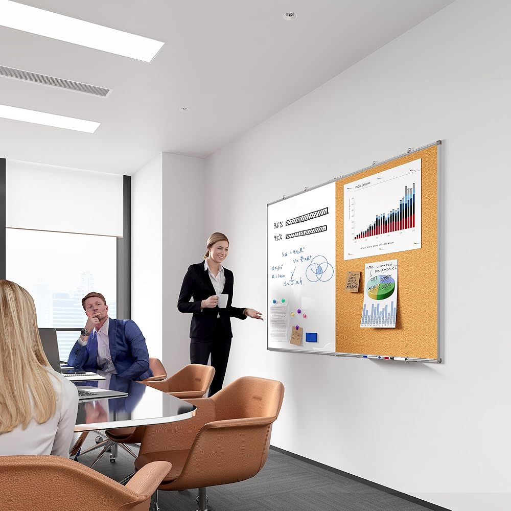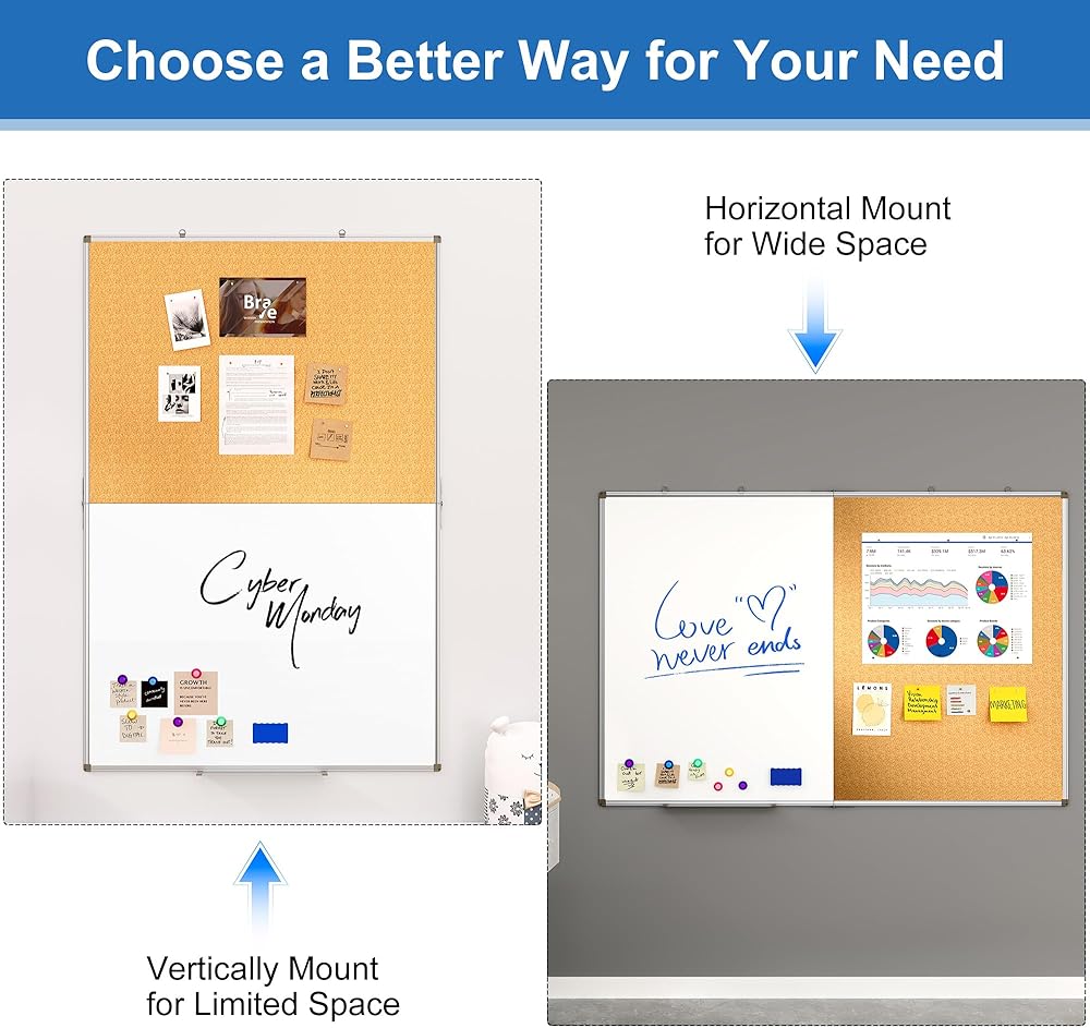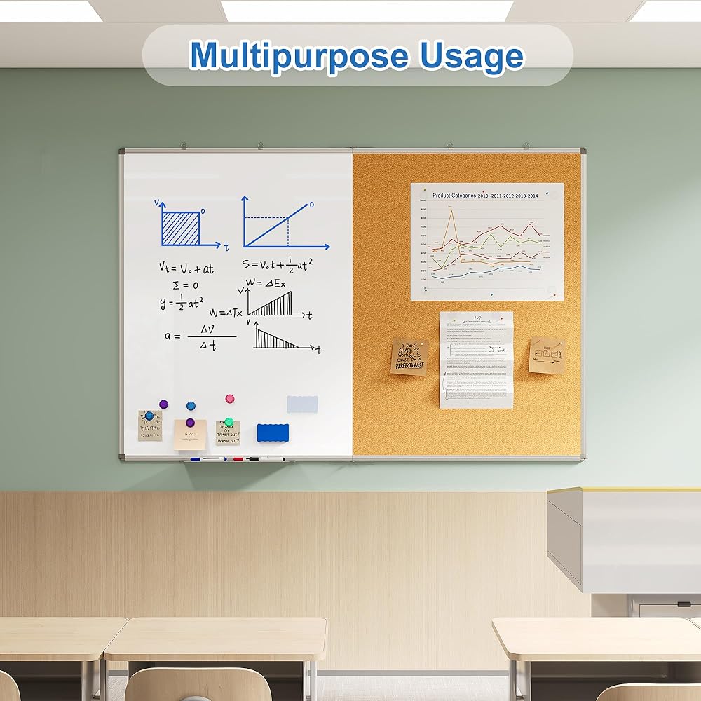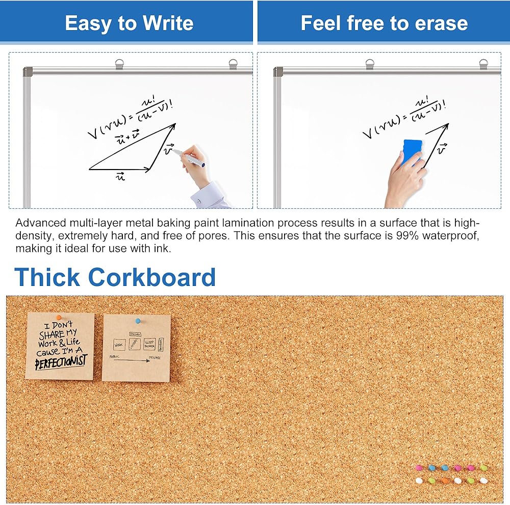 Dual-Purpose Magnetic Surface: This 2-in-1 combo combines a smooth dry-erase whiteboard and a sturdy cork bulletin board. Includes 3 markers, 6 magnets,10 pins, a magnetic eraser and pen tray. Designed for writing, posting notes, and organizing schedules while maximizing wall space efficiency