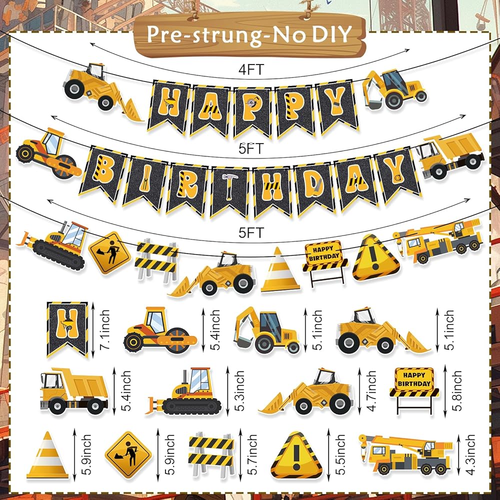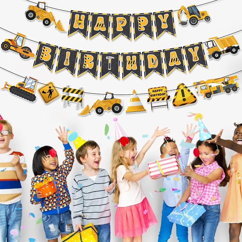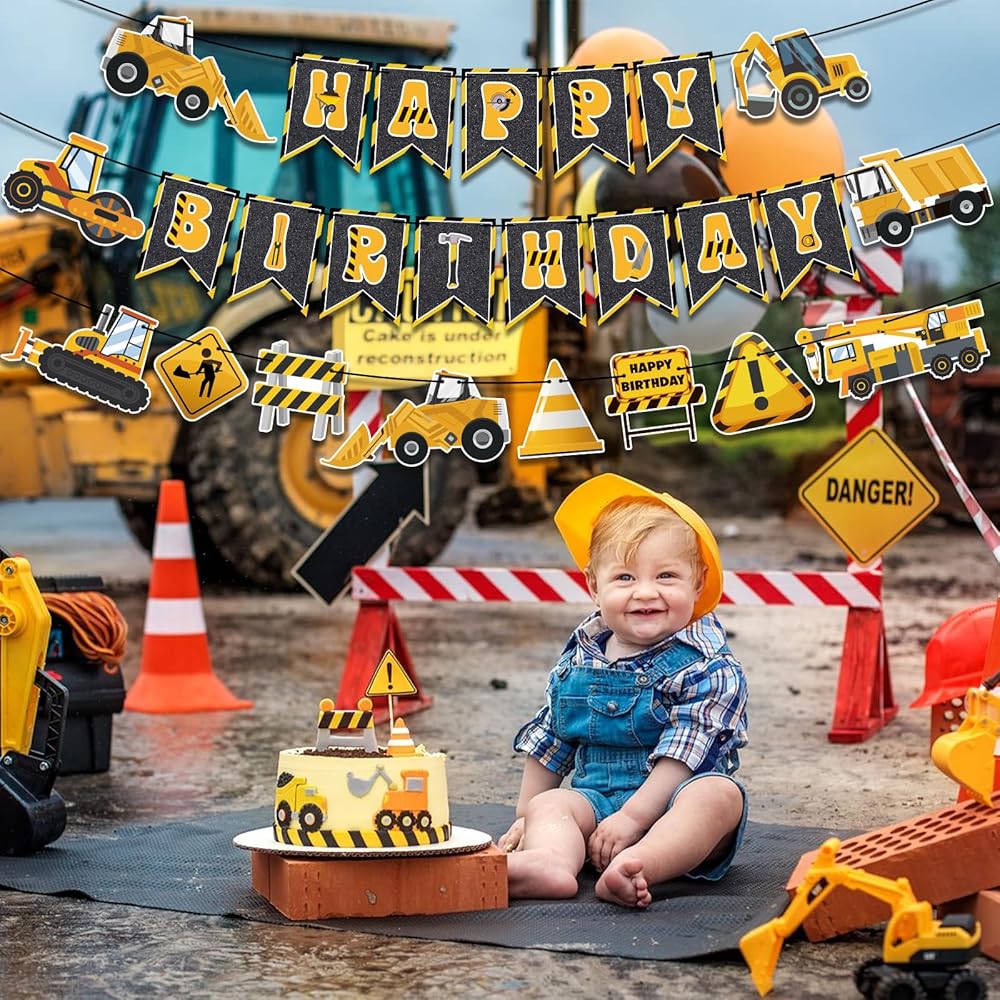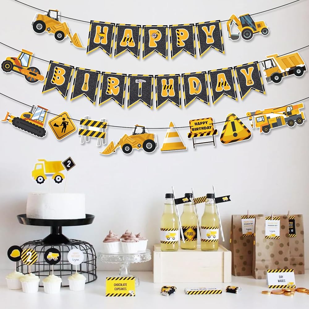 Unique Construction Theme Design: Celebrate your little one's special day with our vibrant Happy Birthday banner featuring fun construction vehicle designs like excavators, bulldozers, cranes, and trucks. Perfect for creating an exciting construction zone atmosphere.