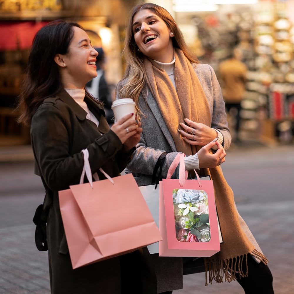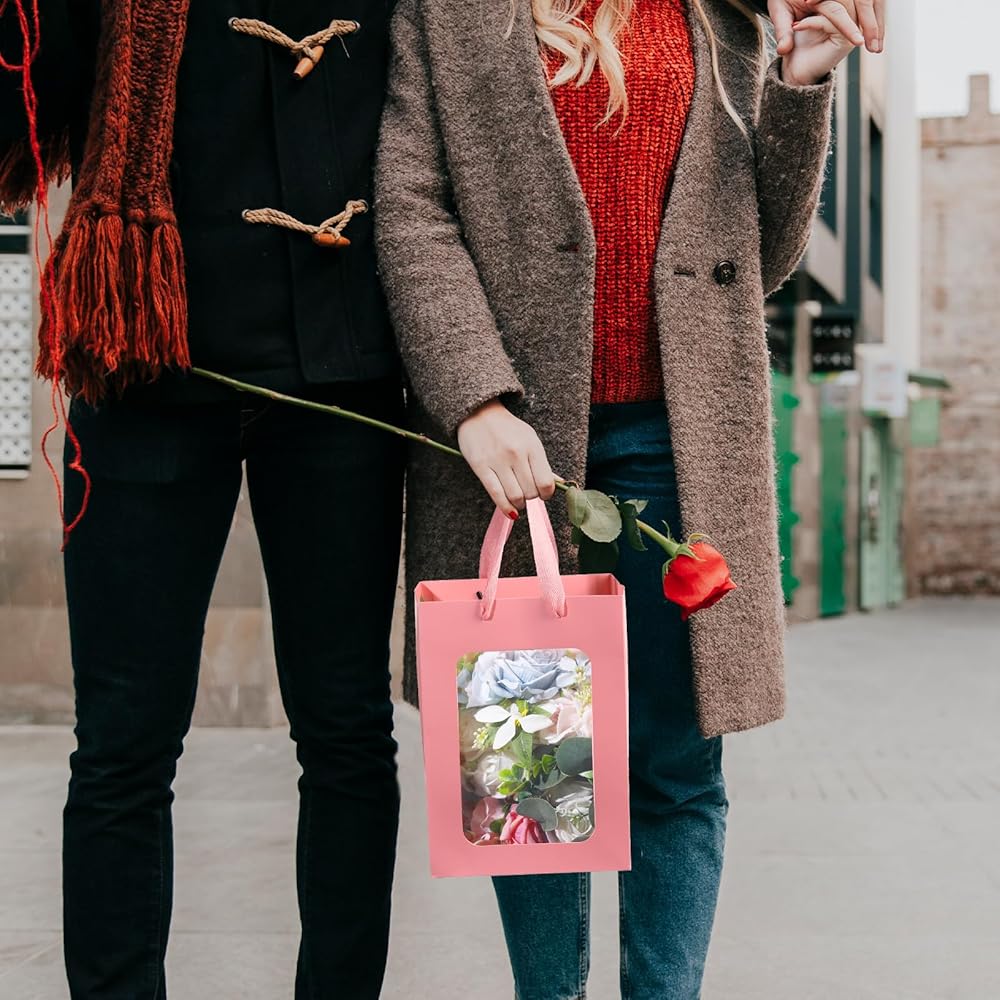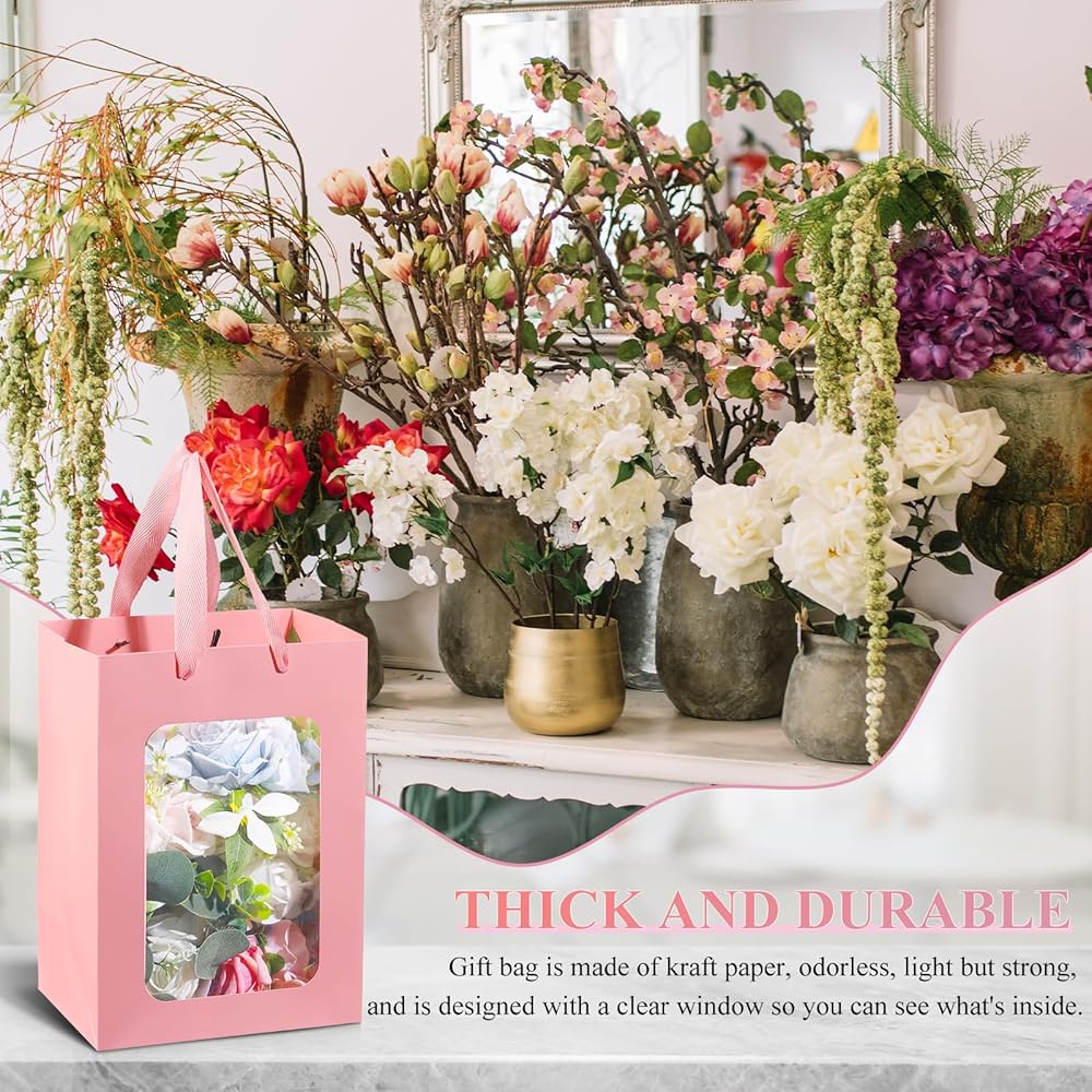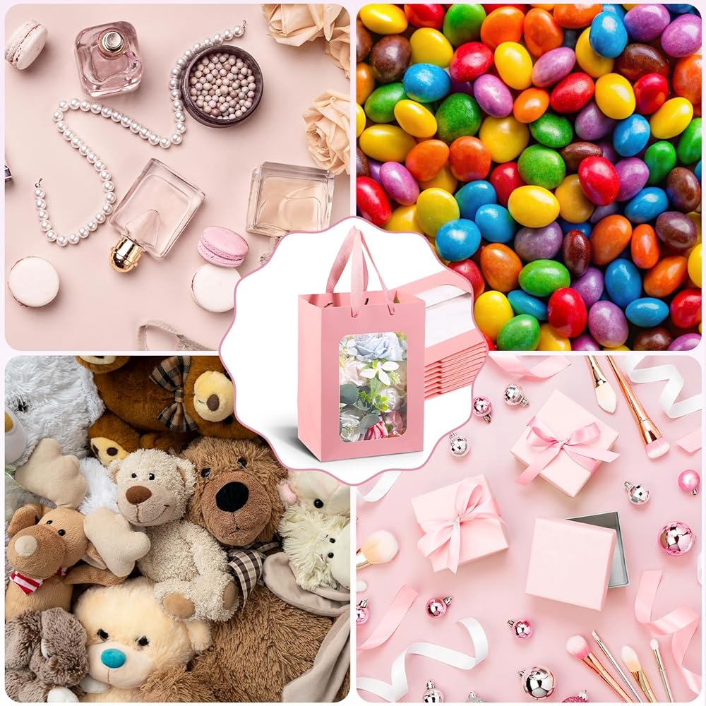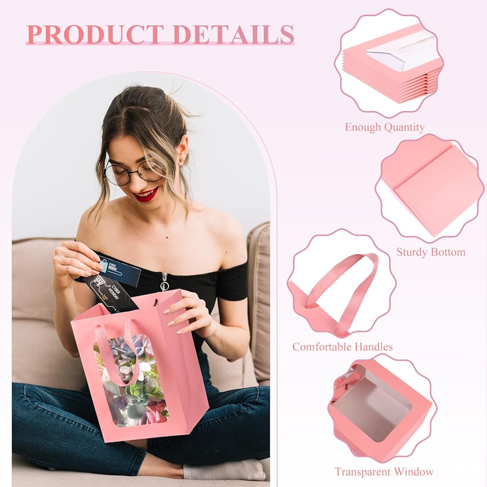 Liobelon 12 Pack Pink Paper Gift Bags with Transparent Window, 10 * 7 * 5in Kraft Shopping Bag with Handle for Flower Bouquet, Party Favors, Valentine's Day