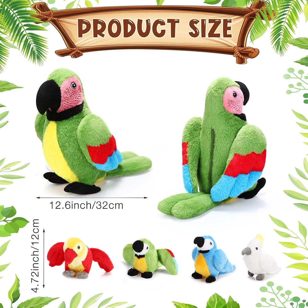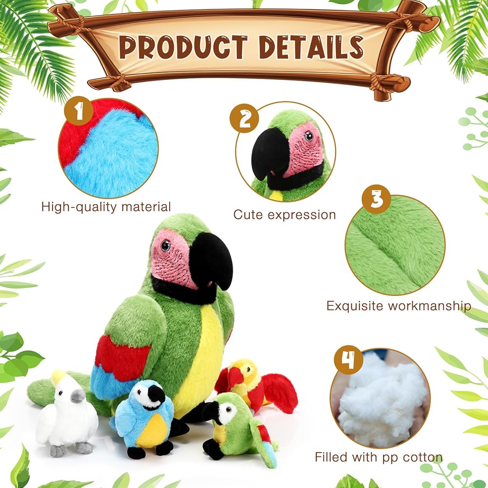 5 in 1 Fun Plush Toys: you will receive a total of 5 parrot plush toys, including a macaw mother about 12.6 inches/ 32 cm high, and 4 different styles of bird plush toys, the size is about 4.72 inches/ 12 cm high, cute and lively, easy to attract people's attention