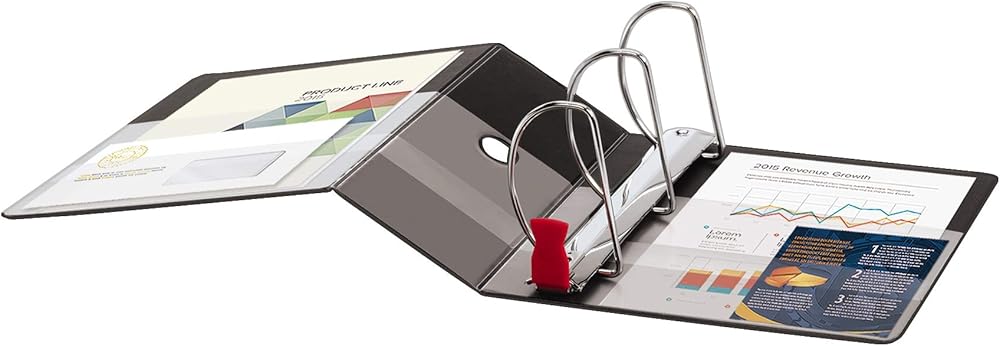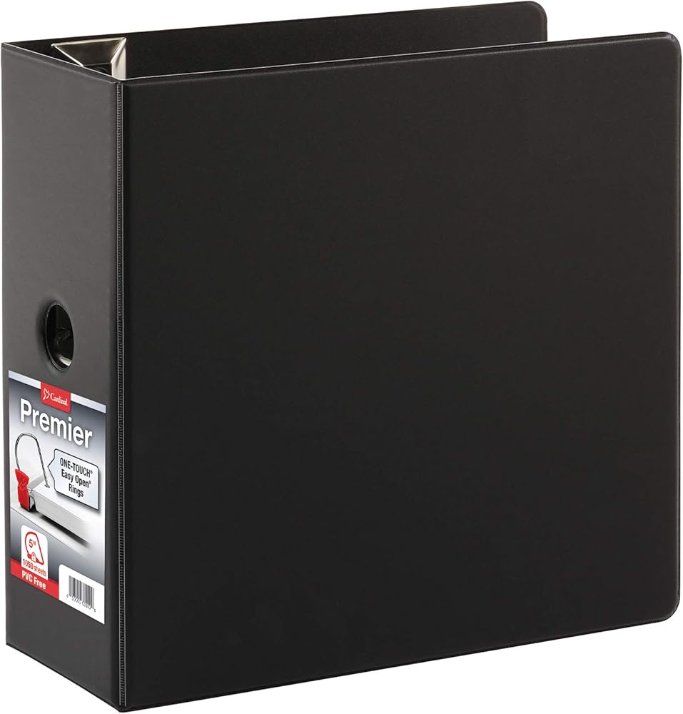 These Cardinal Premier Binders have ONE-TOUCH Easy Open Slant-D rings. Triggers open, close and lock with a simple motion. Takes the strain out of loading or rearranging papers. A no-pinch upgrade for work, home or school. Cover boards are made from 100% recycled fiber with at least 98% post-consumer fiber. Heavy duty, wrinkle-resistant covers provide lasting durability. Made of non-stick, PVC-free materials. Four clear, organization-friendly pockets store more inside. A handy shelf pull makes this large book easier to transport. 5". 1, 050-Sheet capacity. Black.