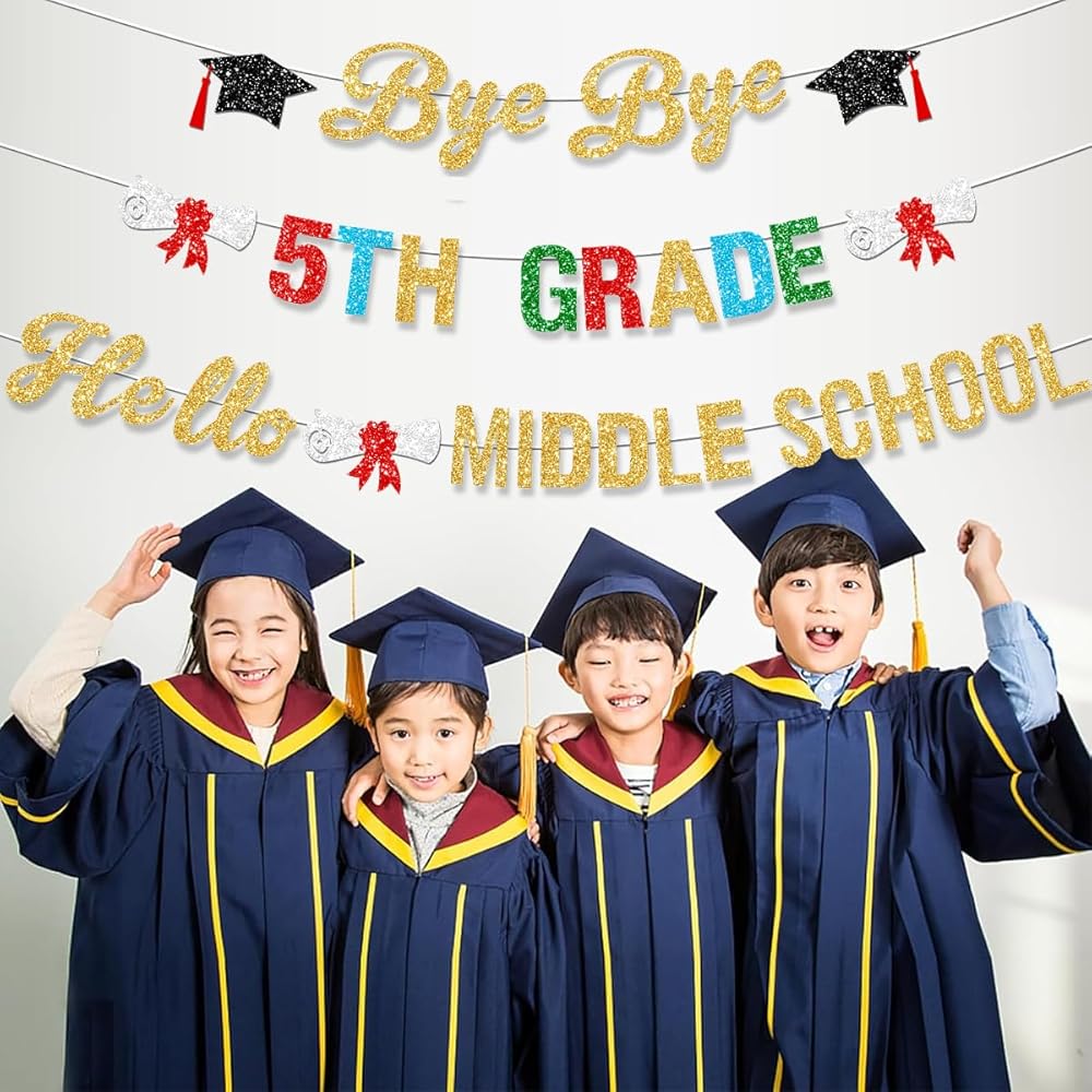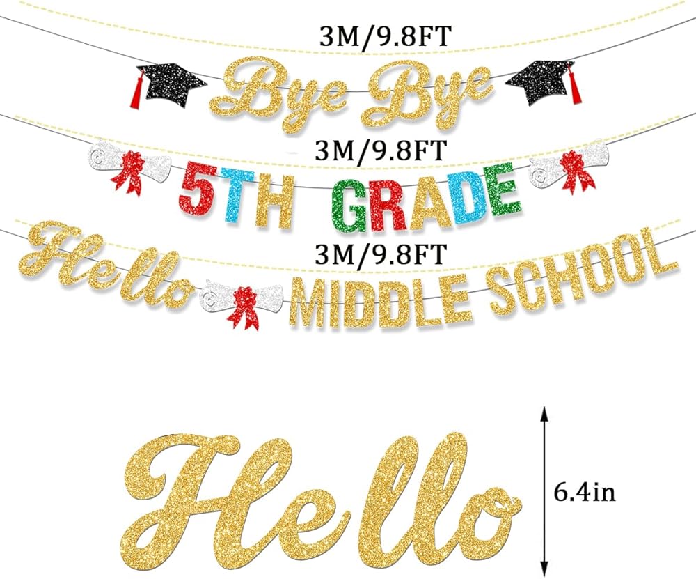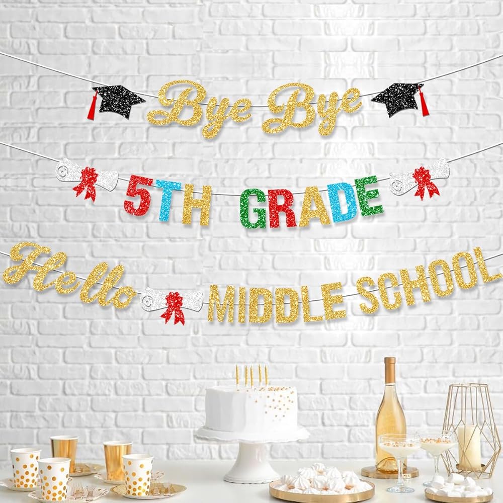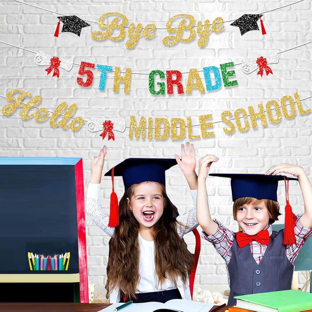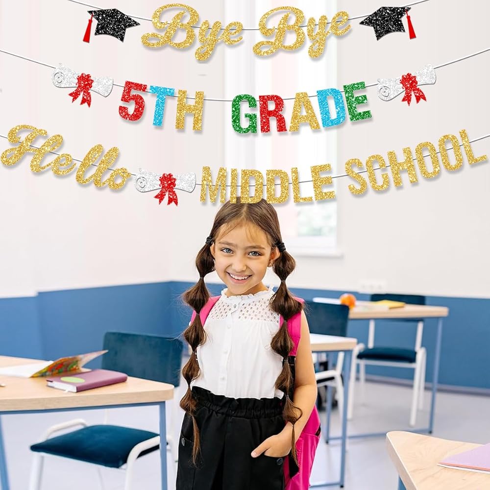 2... Design: Multicolor Glitter Bye Bye 5th Grade grad banner and Gold Glitter Hello middle School Banner perfect for 2025 Elementary School graduation decorations celebrating party decorations