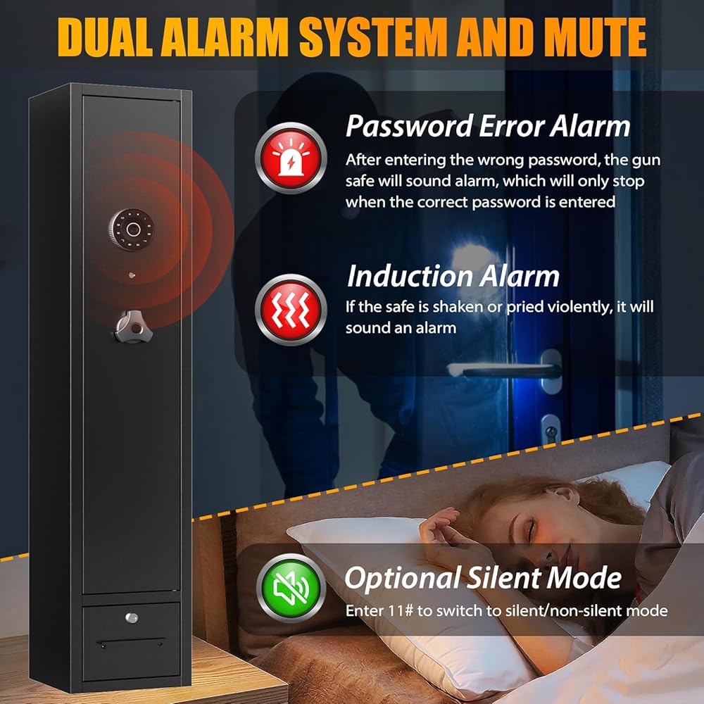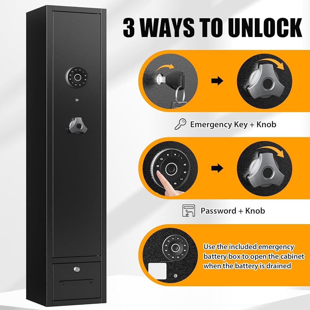 【Sturdy& Durable】The long gun safe is made of cold-rolled steel, featuring an exceptionally sturdy exterior capable of withstanding powerful impacts. It boasts two reinforced latch and three 3 CM diameter solid locking deadbolts, ensuring that children or intruders cannot access your firearms.