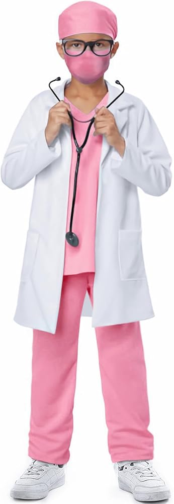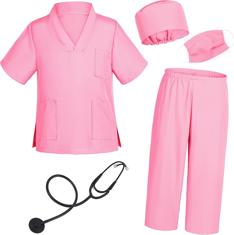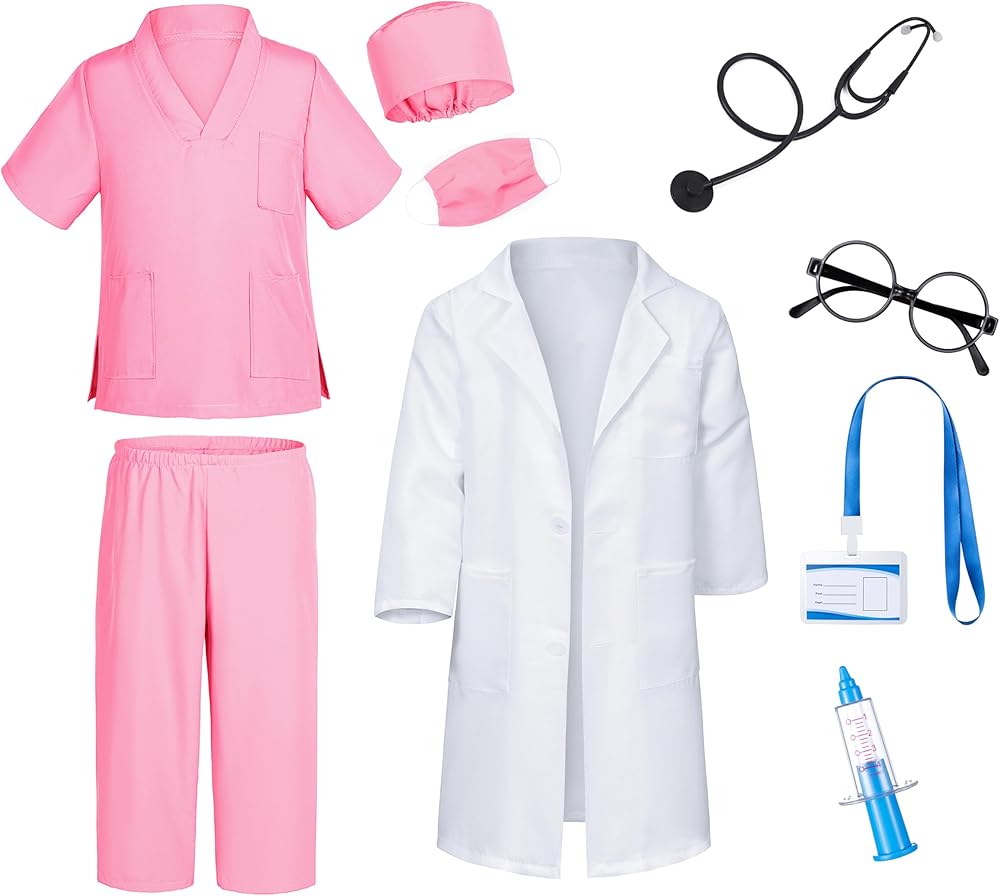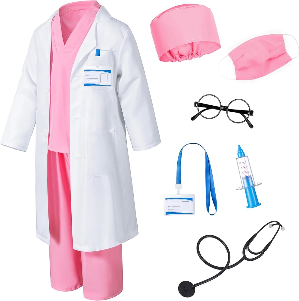 【Doctor Scrubs 9pc set】White coat*1,Scrubs*1,Trousers*1,Cap*1,Mask*1,Stethoscope Props*1,ID Card*1,Toy Glasses*1,Props*1(details in the picture).