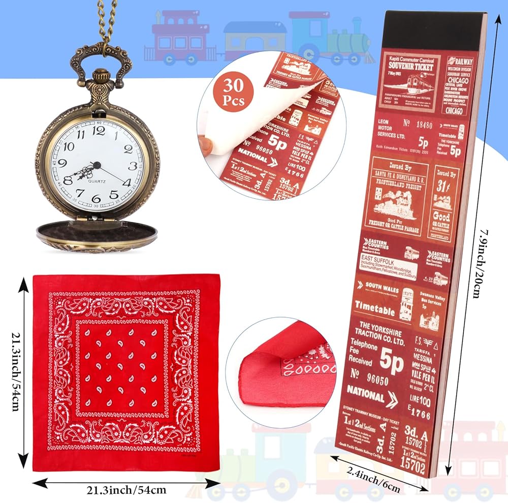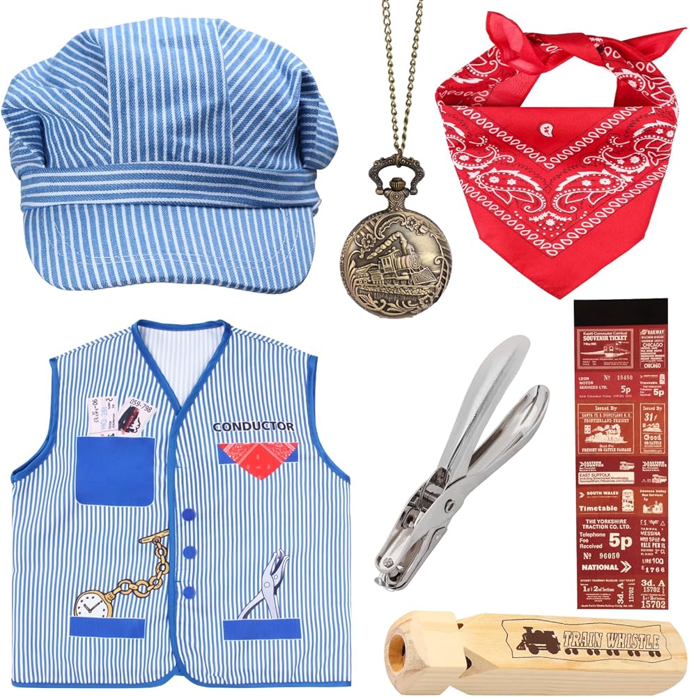 Train Engineer Kit-You'll receive a train conductor vest,a train conductor hat,a wooden train whistle,a paisley bandanna,a pocket watch,a train ticket punch set,comprehensive kit for fulfilling your daily needs and train-themed party requirements